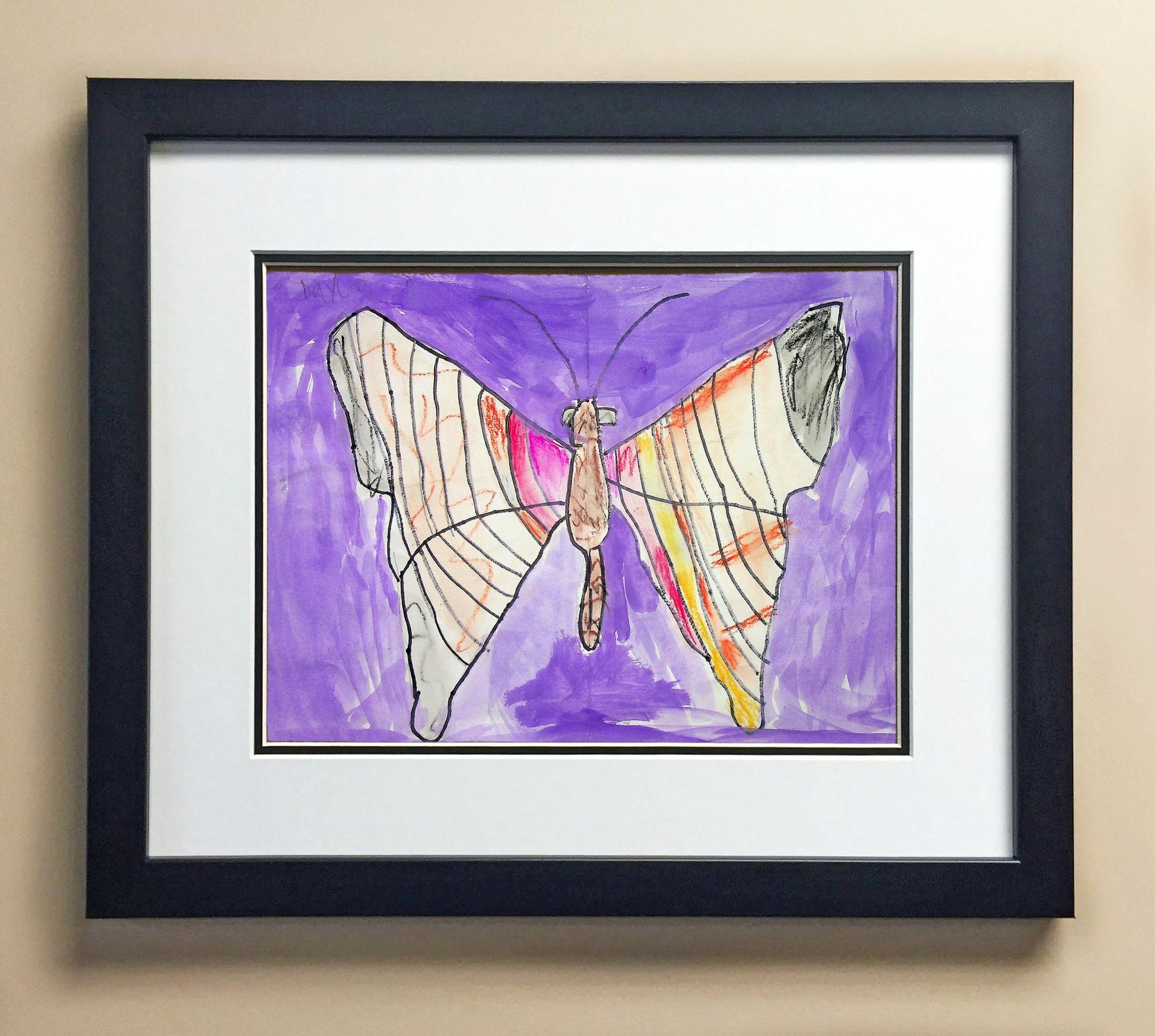 Included with the purchase is the Students Artwork, Frame, double matboard, shatter proof plexiglass, and a ready to hang backerboard with turnbuttons