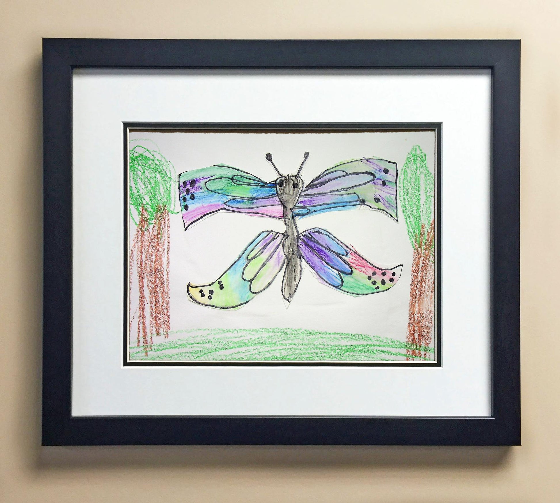 Included with the purchase is the Students Artwork, Frame, double matboard, shatter proof plexiglass, and a ready to hang backerboard with turnbuttons