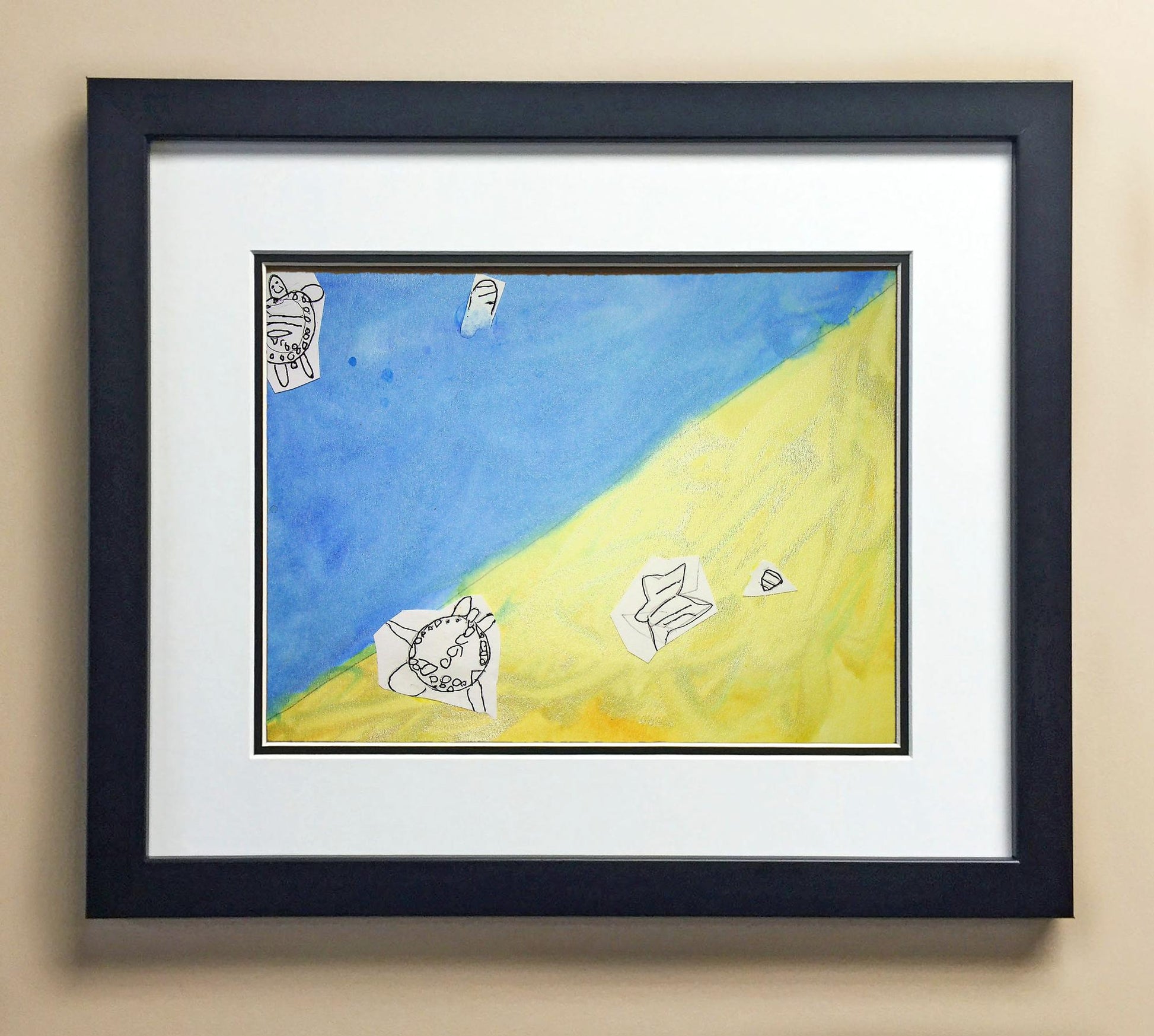 Included with the purchase is the Students Artwork, Frame, double matboard, shatter proof plexiglass, and a ready to hang backerboard with turnbuttons