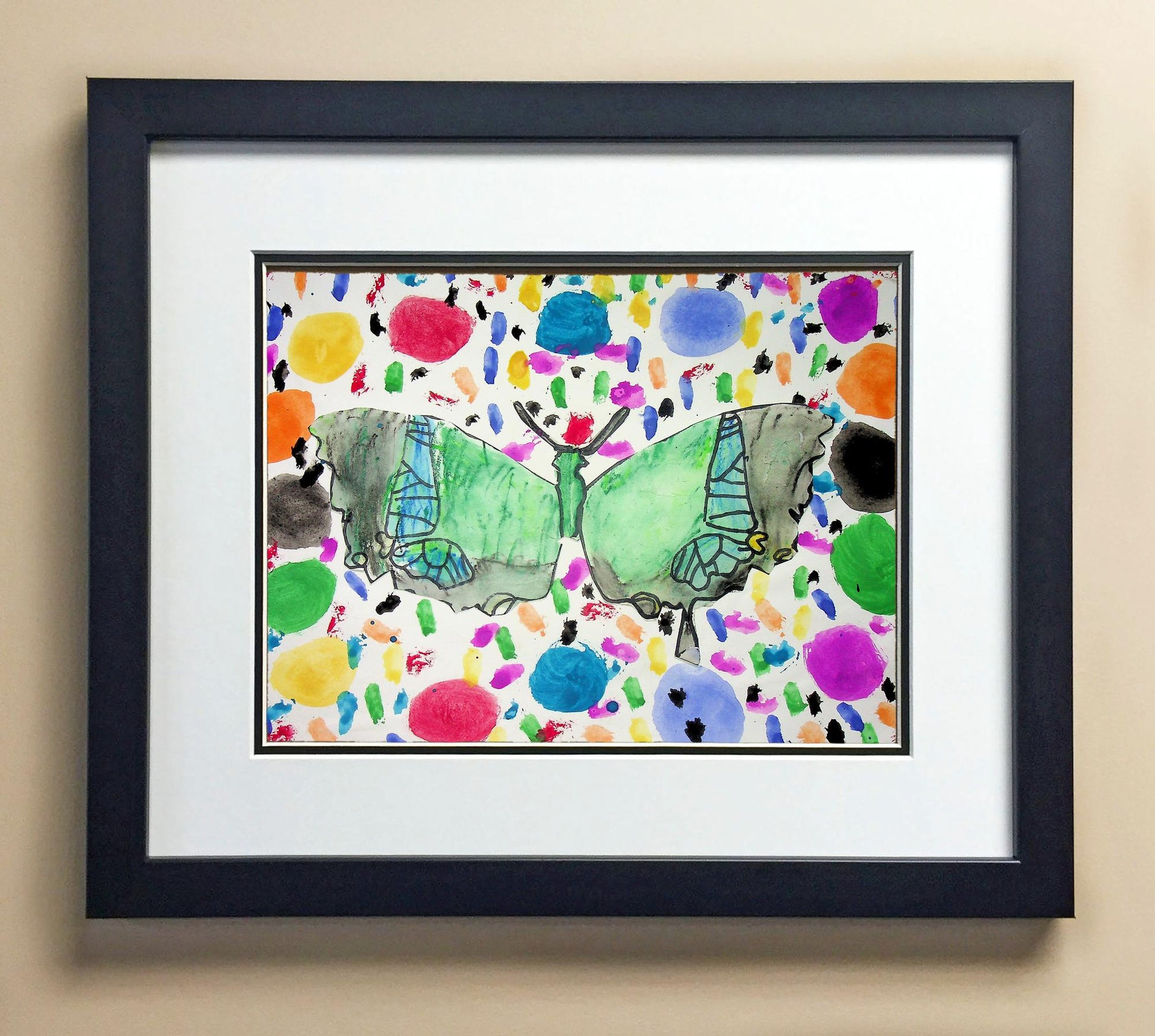 Included with the purchase is the Students Artwork, Frame, double matboard, shatter proof plexiglass, and a ready to hang backerboard with turnbuttons