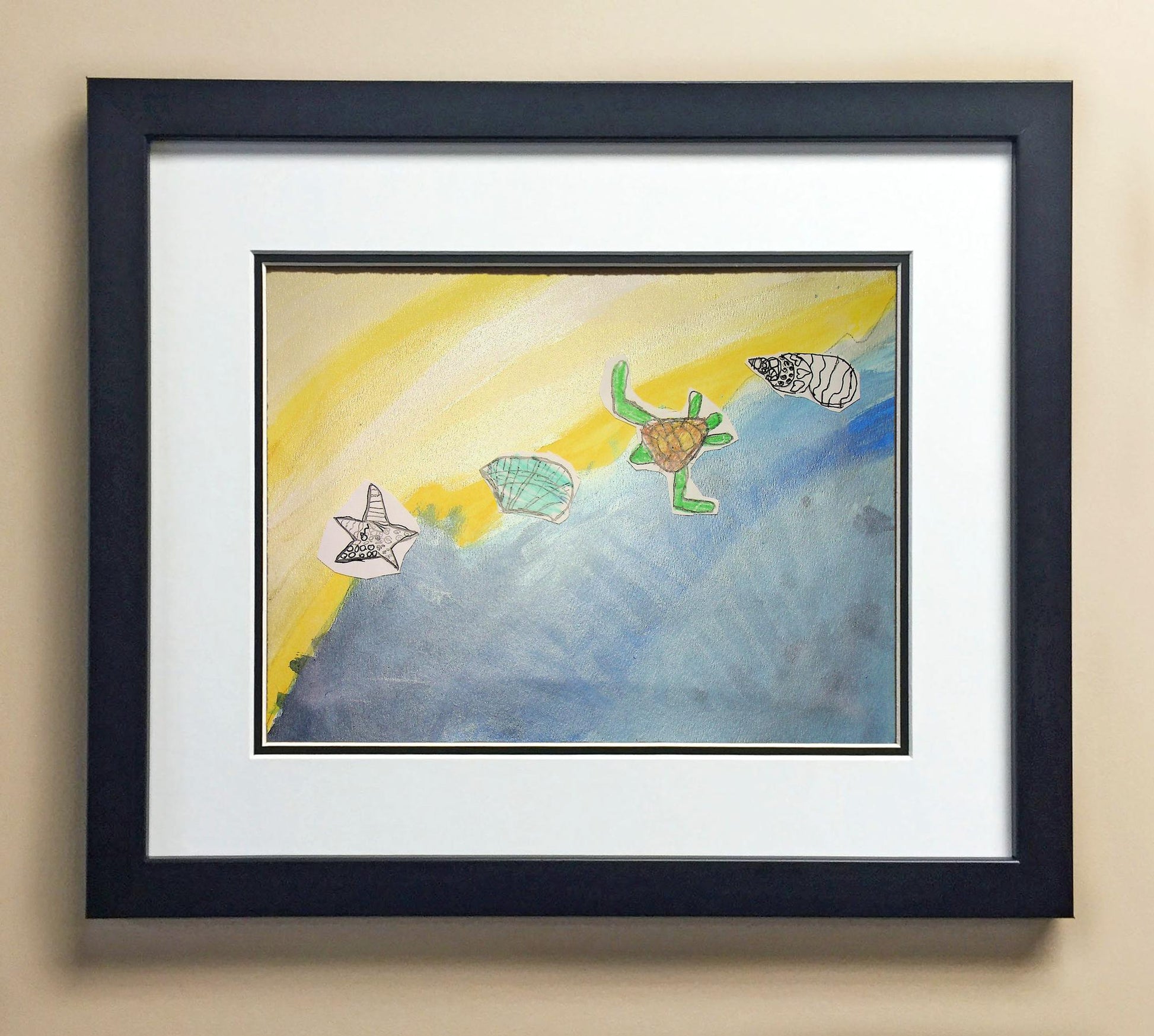 Included with the purchase is the Students Artwork, Frame, double matboard, shatter proof plexiglass, and a ready to hang backerboard with turnbuttons