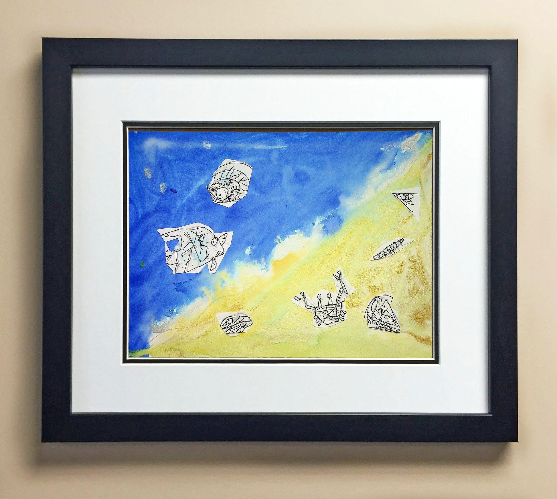 Included with the purchase is the Students Artwork, Frame, double matboard, shatter proof plexiglass, and a ready to hang backerboard with turnbuttons