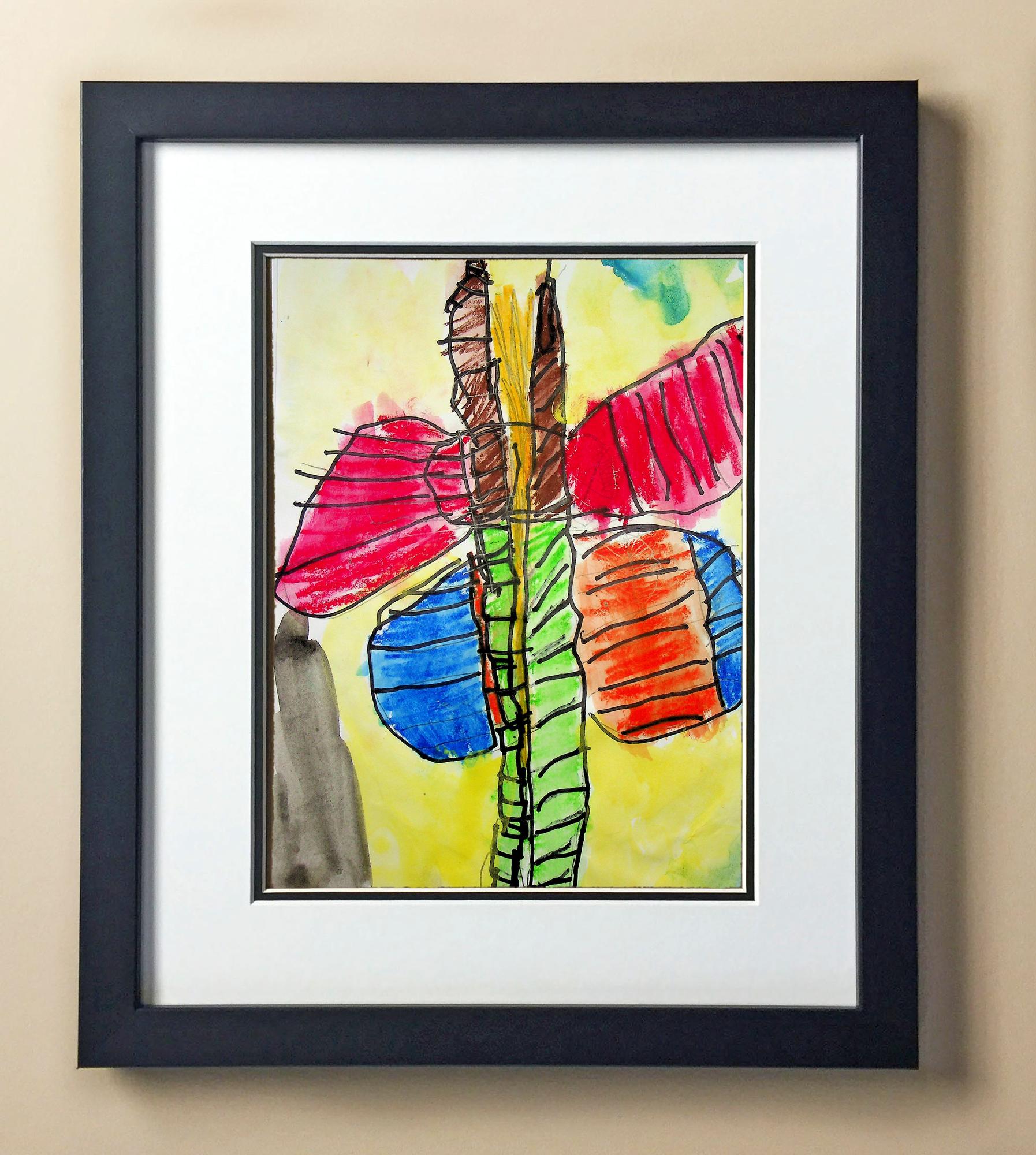 Included with the purchase is the Students Artwork, Frame, double matboard, shatter proof plexiglass, and a ready to hang backerboard with turnbuttons