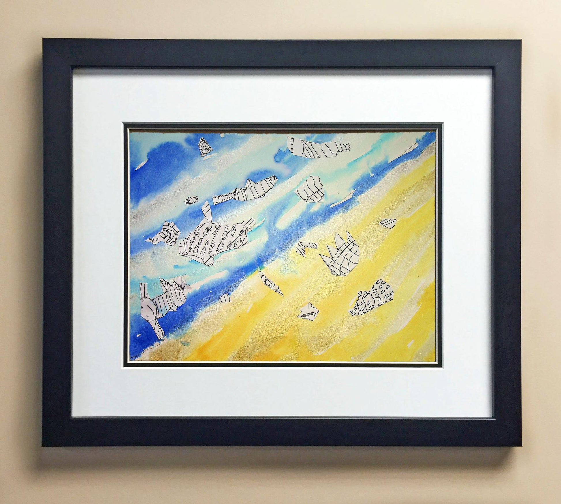 Included with the purchase is the Students Artwork, Frame, double matboard, shatter proof plexiglass, and a ready to hang backerboard with turnbuttons