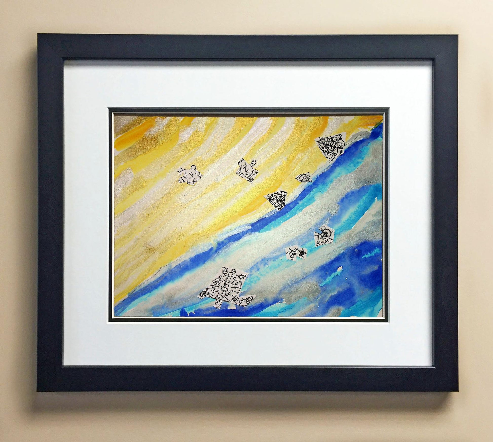 Included with the purchase is the Students Artwork, Frame, double matboard, shatter proof plexiglass, and a ready to hang backerboard with turnbuttons