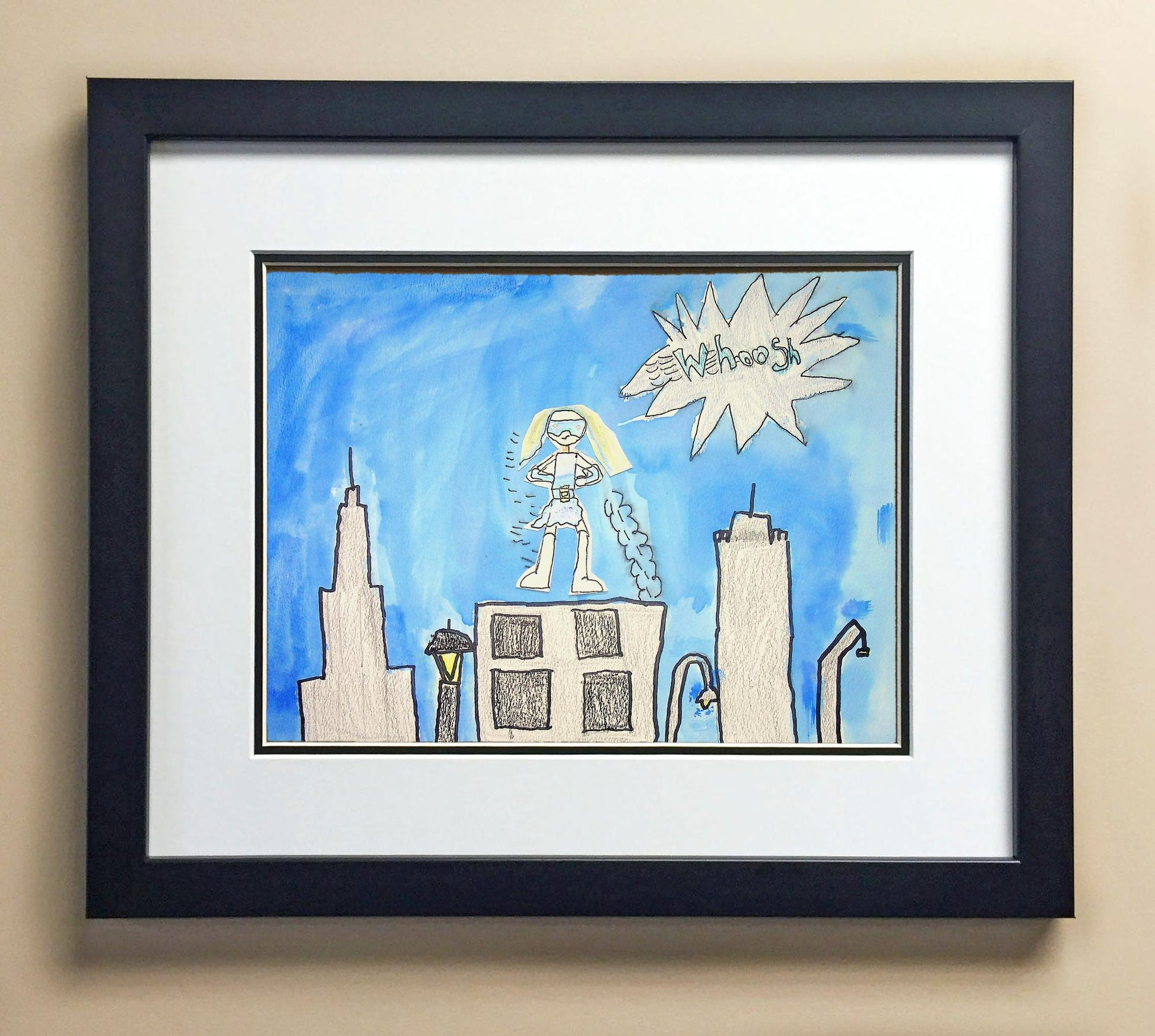 Included with the purchase is the Students Artwork, Frame, double matboard, shatter proof plexiglass, and a ready to hang backerboard with turnbuttons