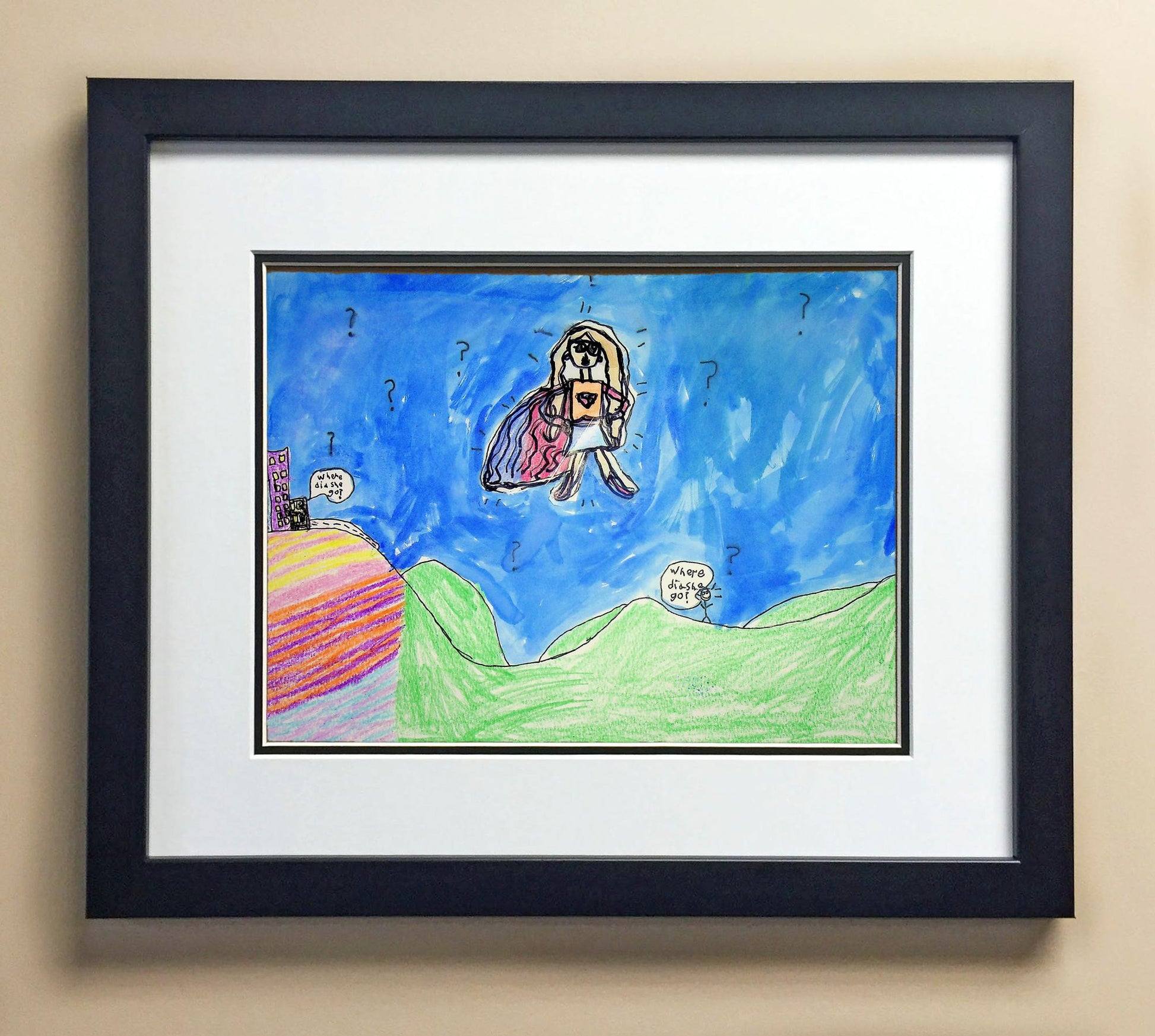 Included with the purchase is the Students Artwork, Frame, double matboard, shatter proof plexiglass, and a ready to hang backerboard with turnbuttons