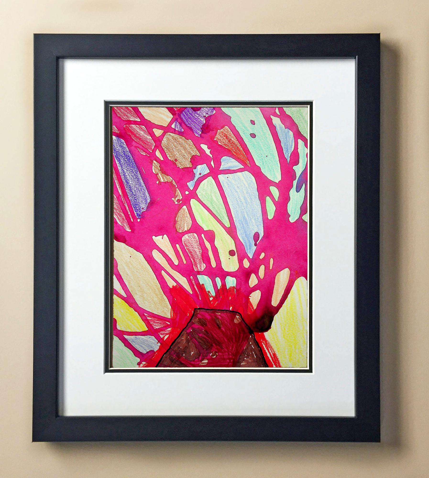 Included with the purchase is the Students Artwork, Frame, double matboard, shatter proof plexiglass, and a ready to hang backerboard with turnbuttons