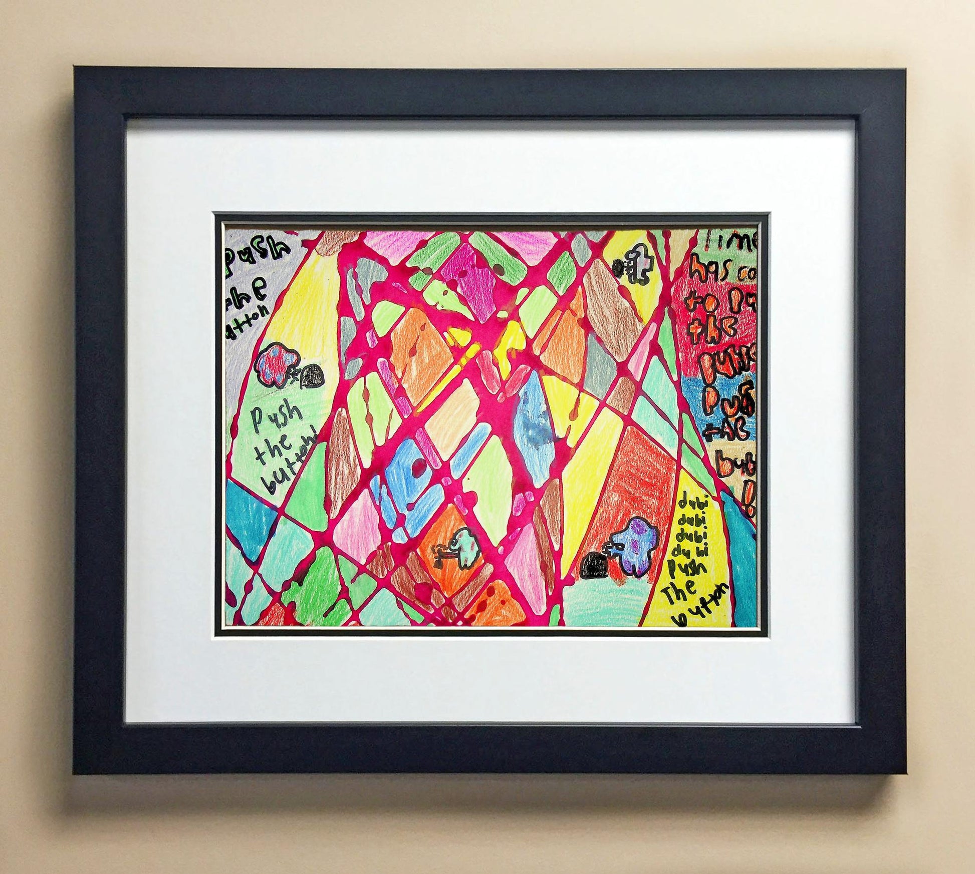 Included with the purchase is the Students Artwork, Frame, double matboard, shatter proof plexiglass, and a ready to hang backerboard with turnbuttons