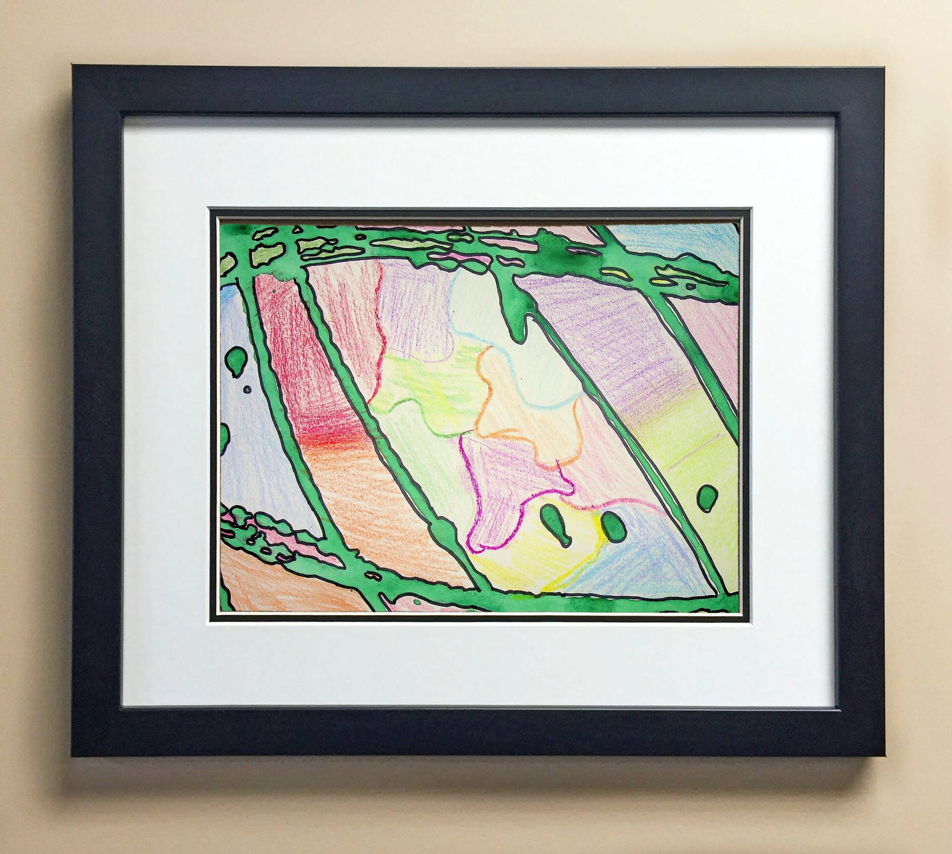 Included with the purchase is the Students Artwork, Frame, double matboard, shatter proof plexiglass, and a ready to hang backerboard with turnbuttons