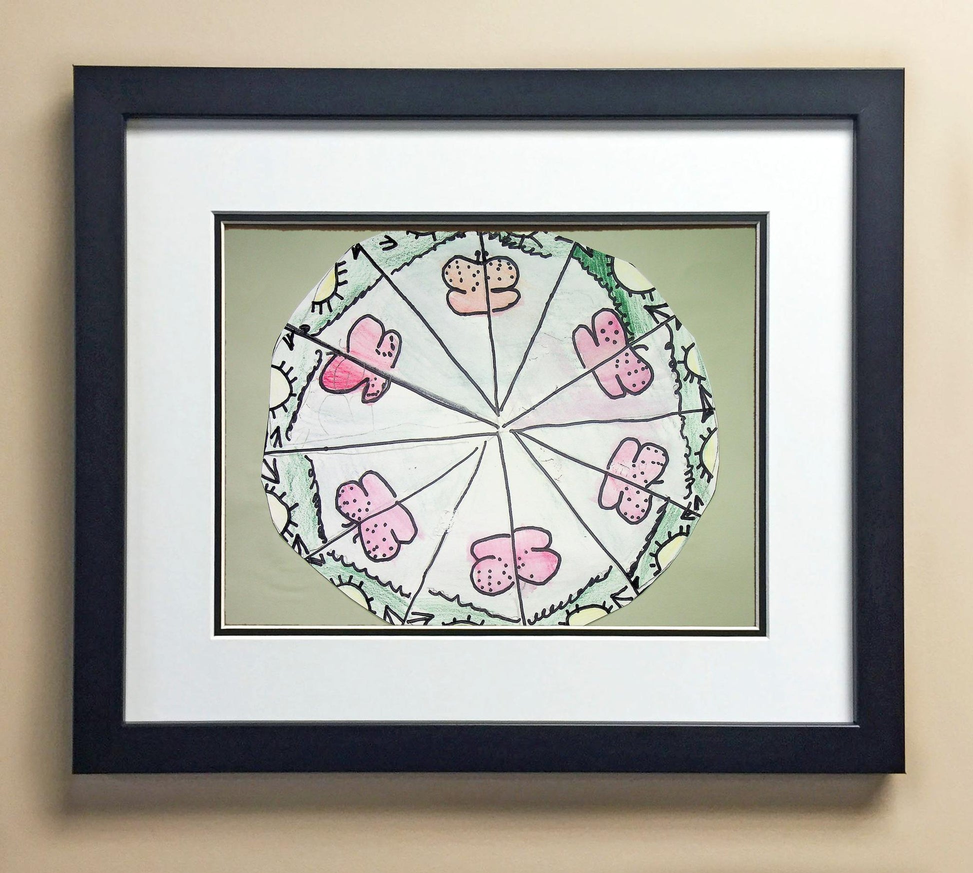 Included with the purchase is the Students Artwork, Frame, double matboard, shatter proof plexiglass, and a ready to hang backerboard with turnbuttons