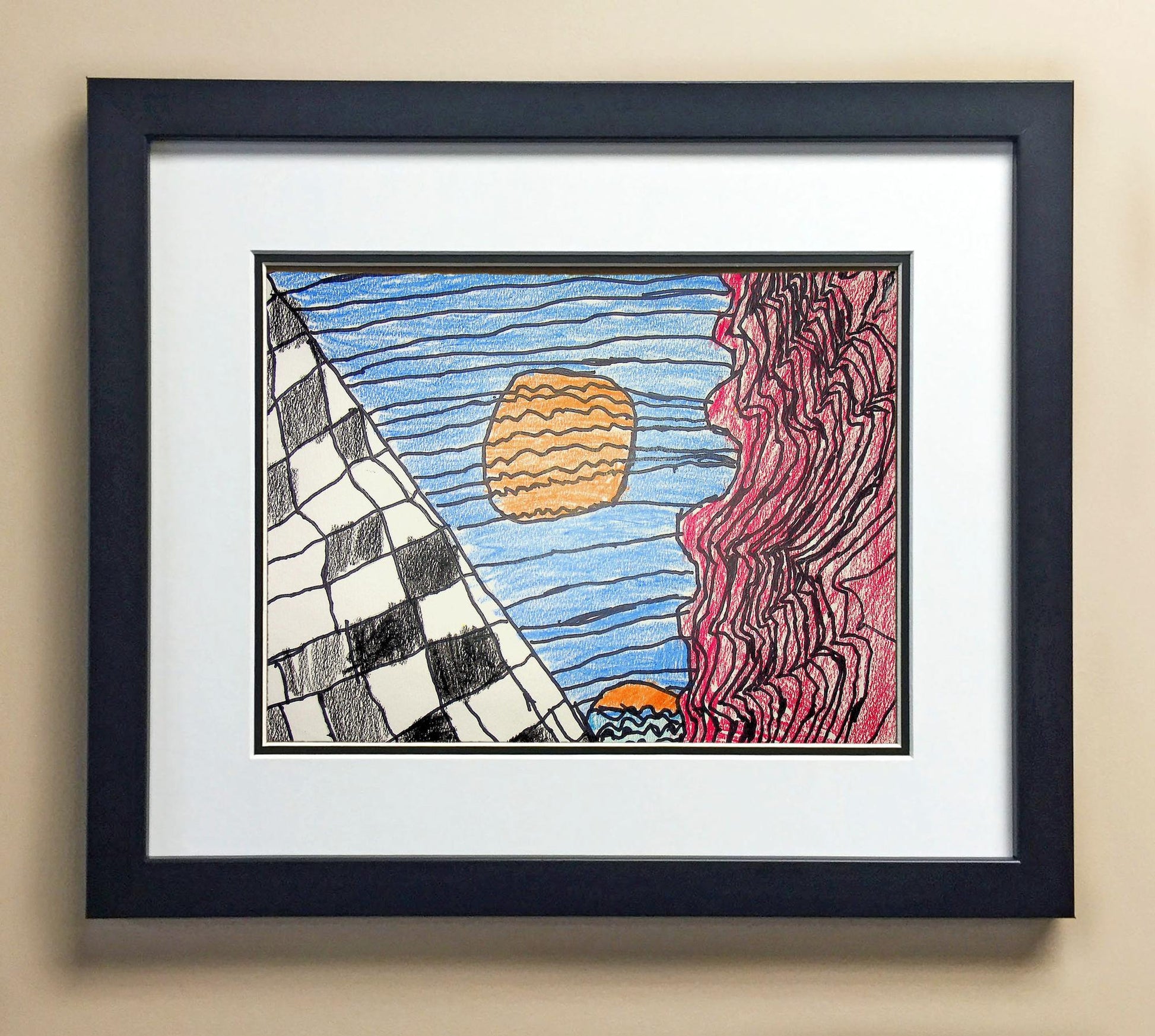 Included with the purchase is the Students Artwork, Frame, double matboard, shatter proof plexiglass, and a ready to hang backerboard with turnbuttons