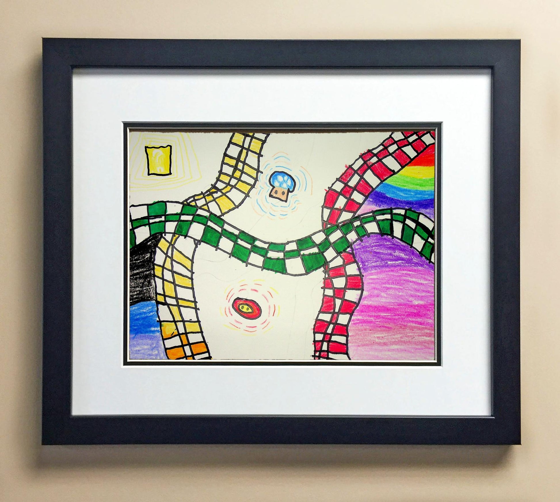 Included with the purchase is the Students Artwork, Frame, double matboard, shatter proof plexiglass, and a ready to hang backerboard with turnbuttons