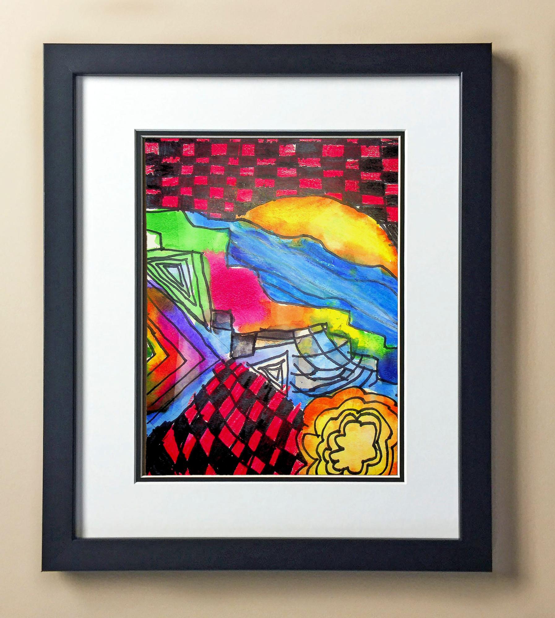 Included with the purchase is the Students Artwork, Frame, double matboard, shatter proof plexiglass, and a ready to hang backerboard with turnbuttons