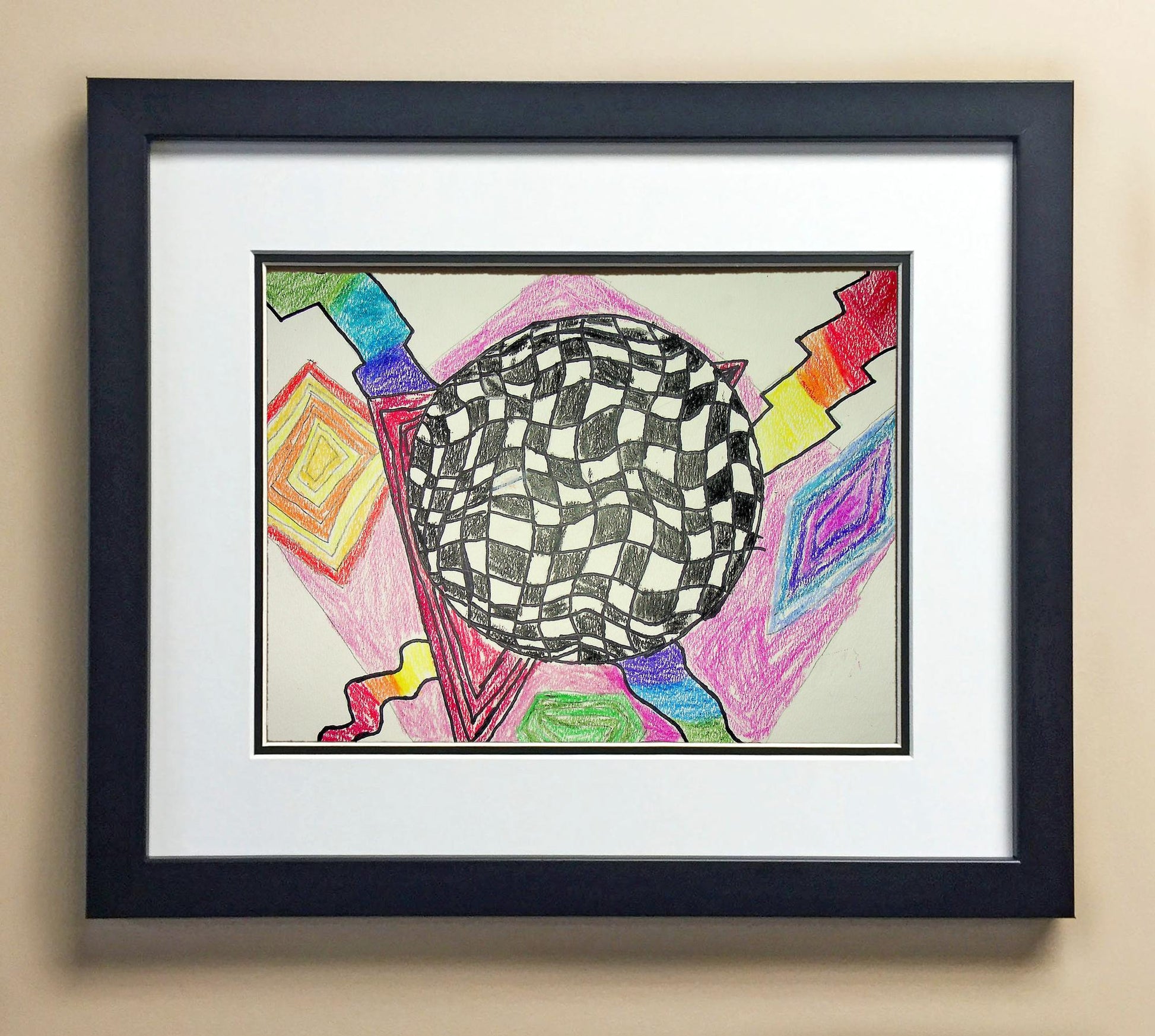 Included with the purchase is the Students Artwork, Frame, double matboard, shatter proof plexiglass, and a ready to hang backerboard with turnbuttons