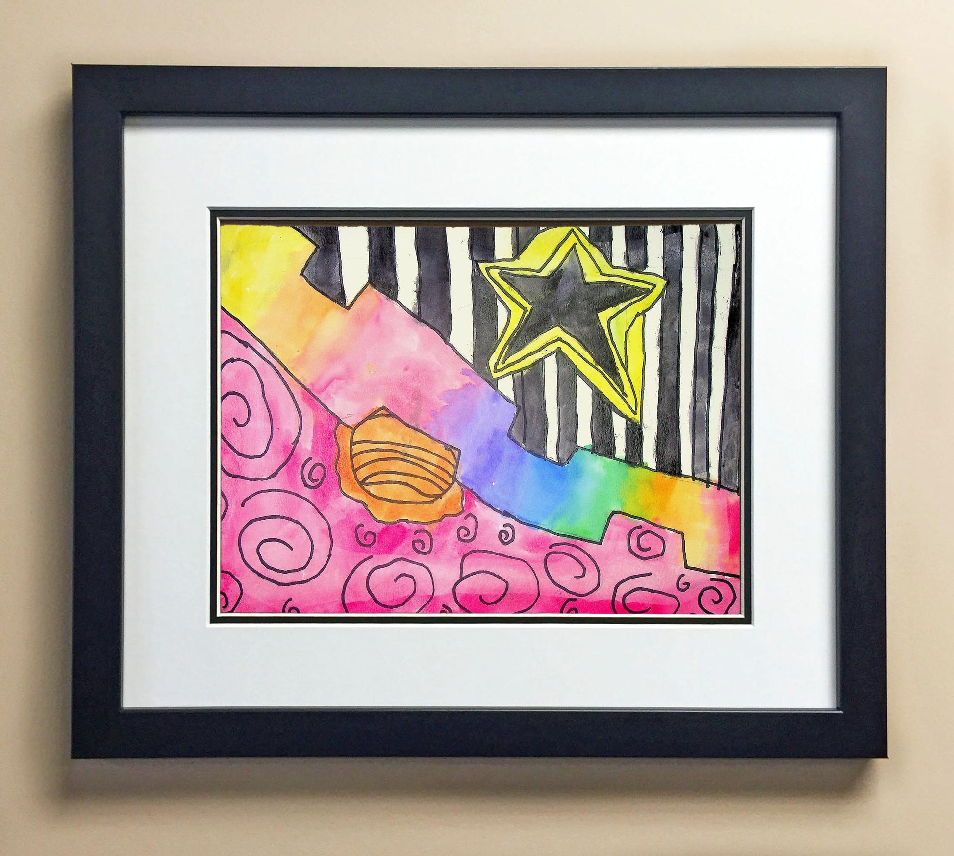 Included with the purchase is the Students Artwork, Frame, double matboard, shatter proof plexiglass, and a ready to hang backerboard with turnbuttons