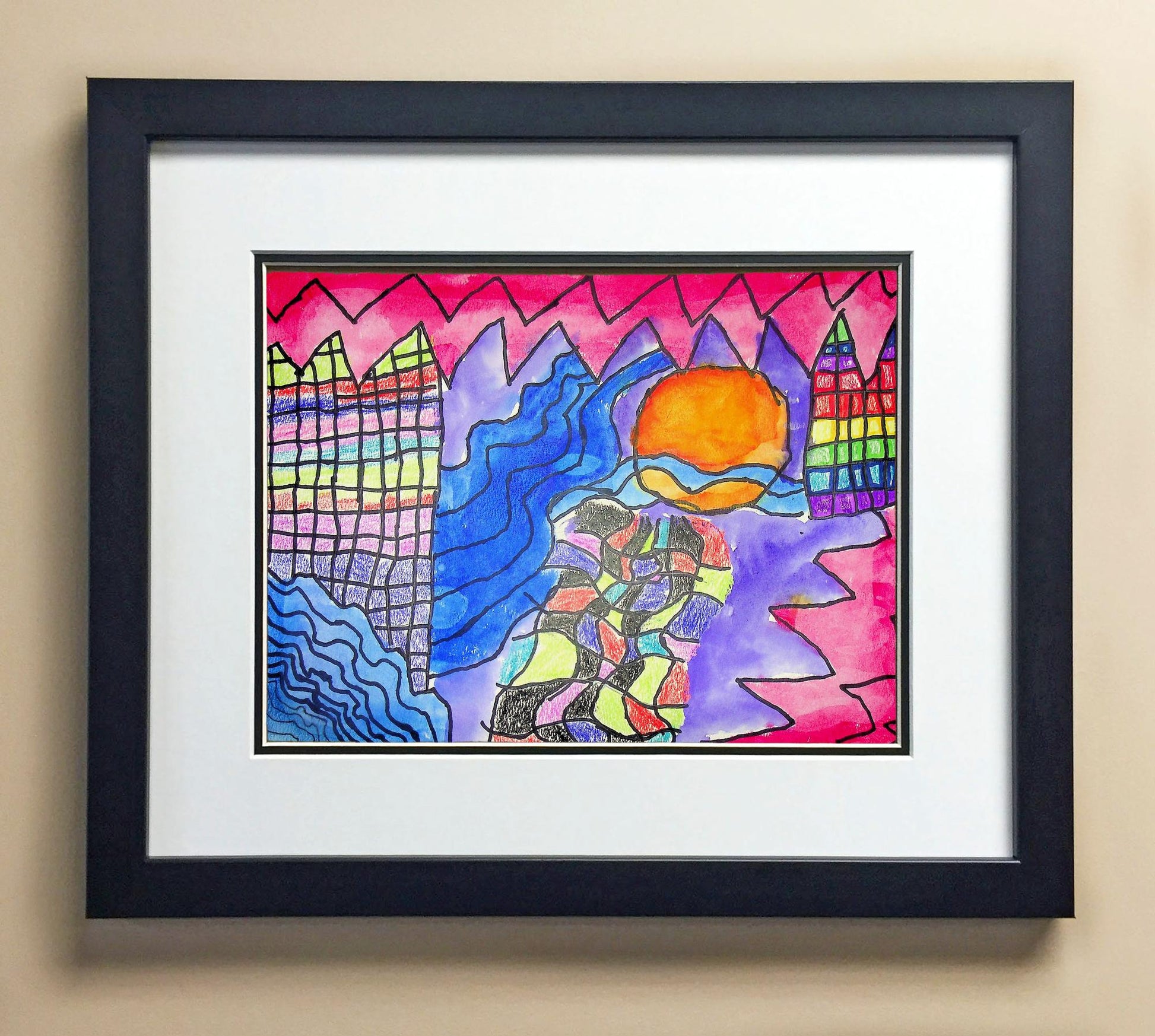 Included with the purchase is the Students Artwork, Frame, double matboard, shatter proof plexiglass, and a ready to hang backerboard with turnbuttons