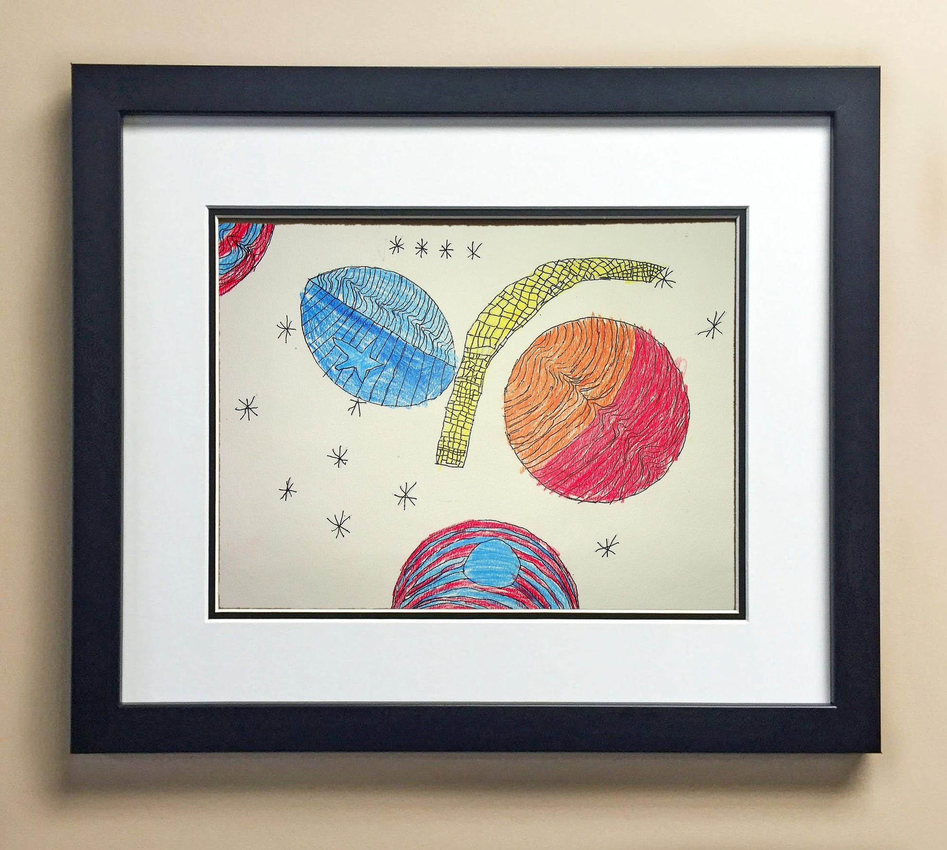 Included with the purchase is the Students Artwork, Frame, double matboard, shatter proof plexiglass, and a ready to hang backerboard with turnbuttons