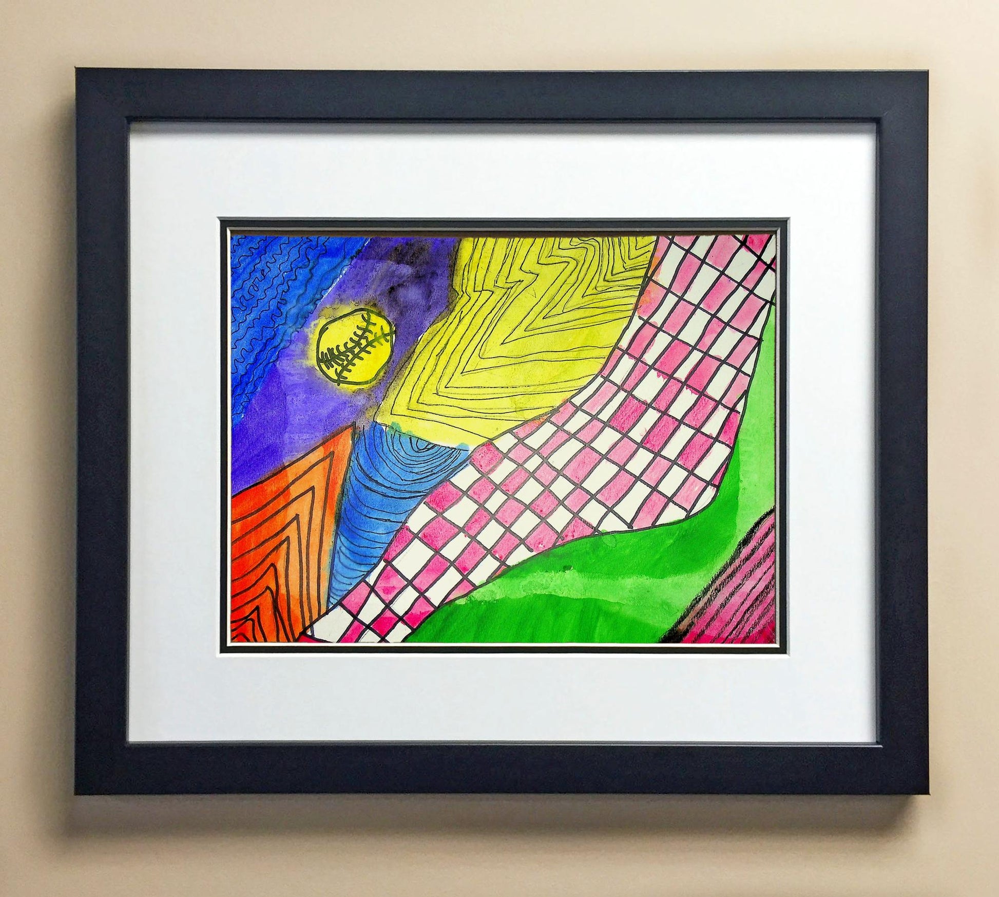 Included with the purchase is the Students Artwork, Frame, double matboard, shatter proof plexiglass, and a ready to hang backerboard with turnbuttons