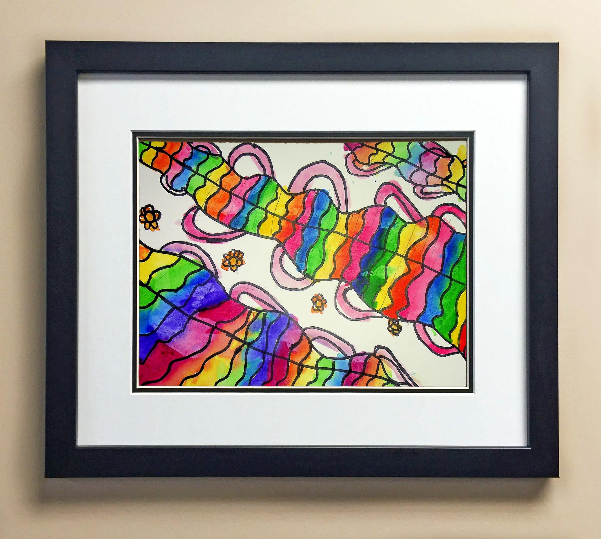 Included with the purchase is the Students Artwork, Frame, double matboard, shatter proof plexiglass, and a ready to hang backerboard with turnbuttons