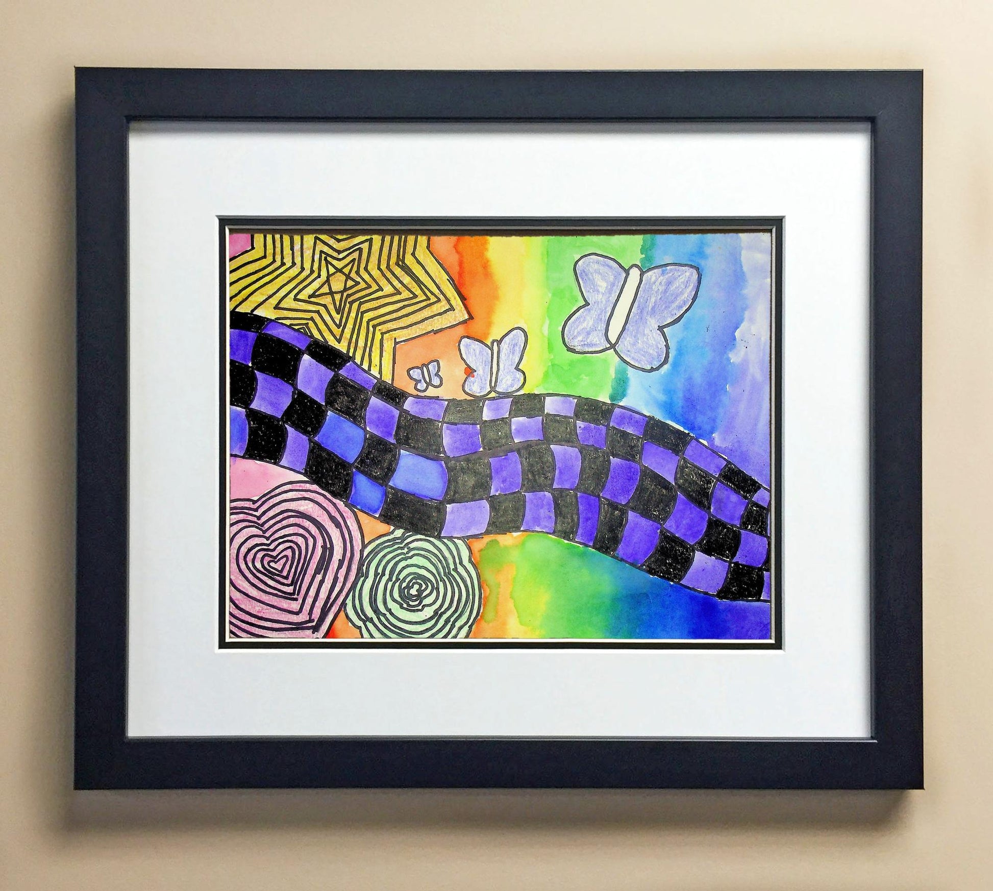 Included with the purchase is the Students Artwork, Frame, double matboard, shatter proof plexiglass, and a ready to hang backerboard with turnbuttons