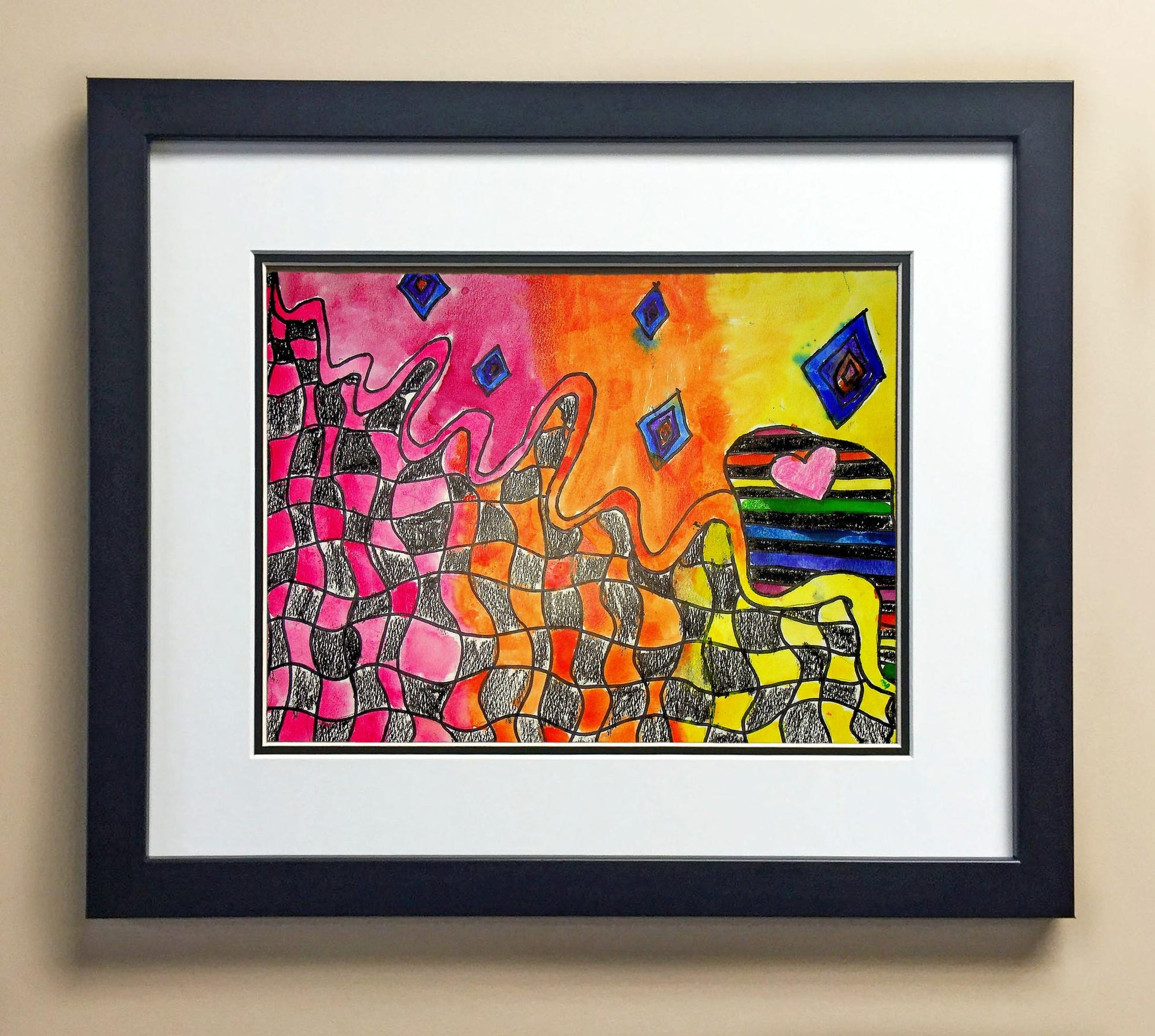 Included with the purchase is the Students Artwork, Frame, double matboard, shatter proof plexiglass, and a ready to hang backerboard with turnbuttons