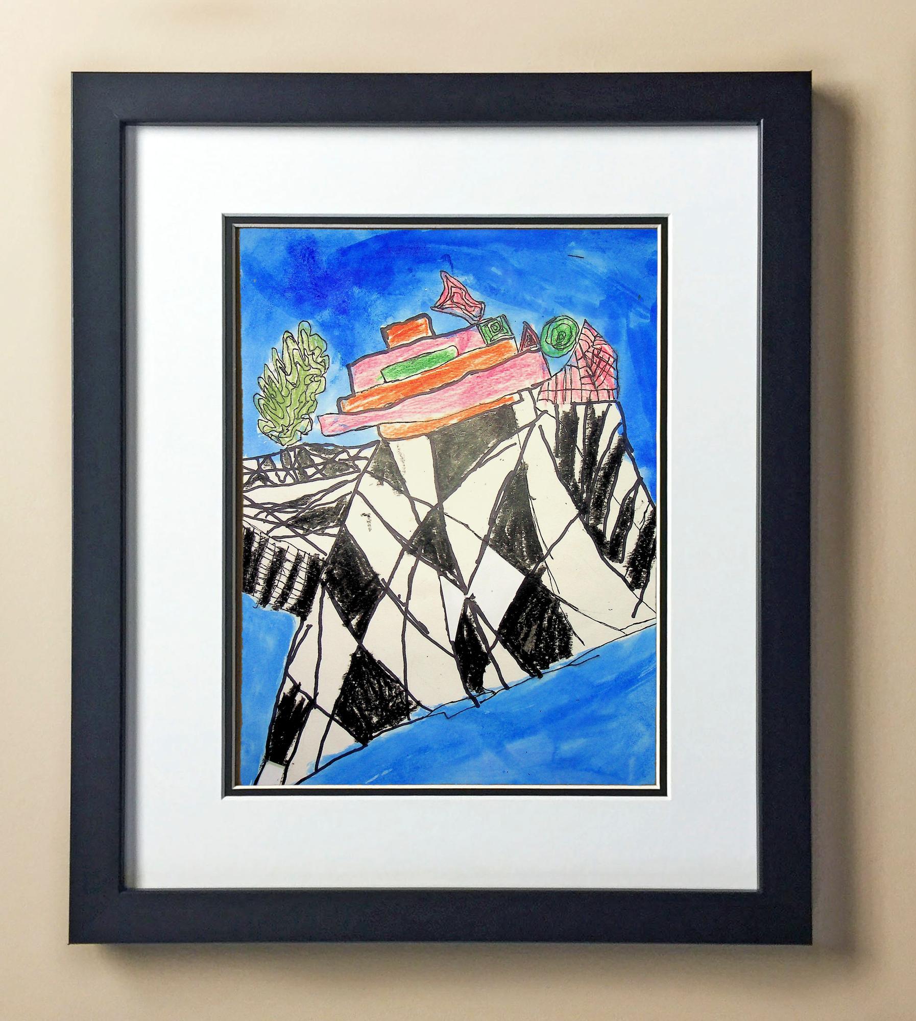 Included with the purchase is the Students Artwork, Frame, double matboard, shatter proof plexiglass, and a ready to hang backerboard with turnbuttons
