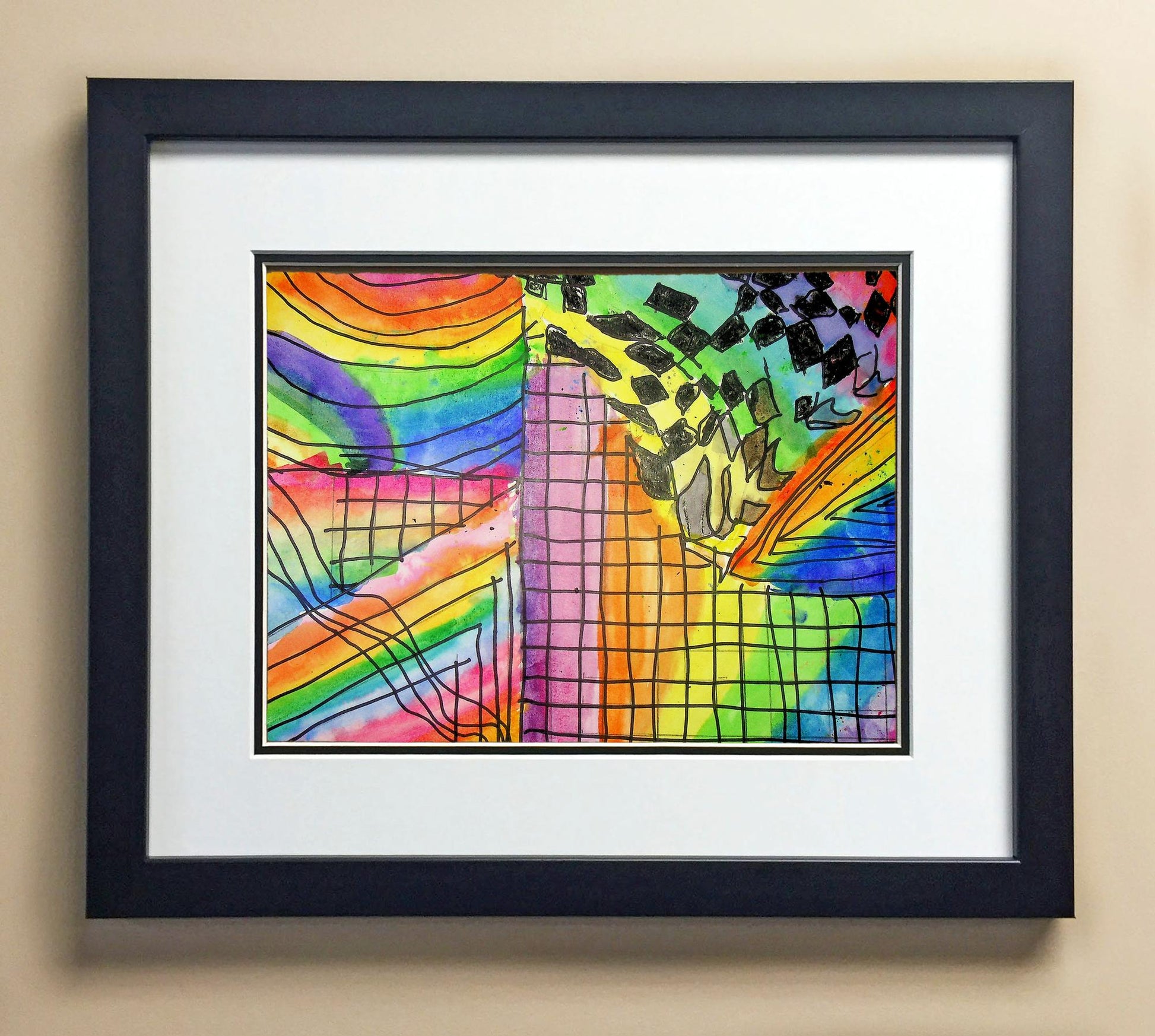 Included with the purchase is the Students Artwork, Frame, double matboard, shatter proof plexiglass, and a ready to hang backerboard with turnbuttons