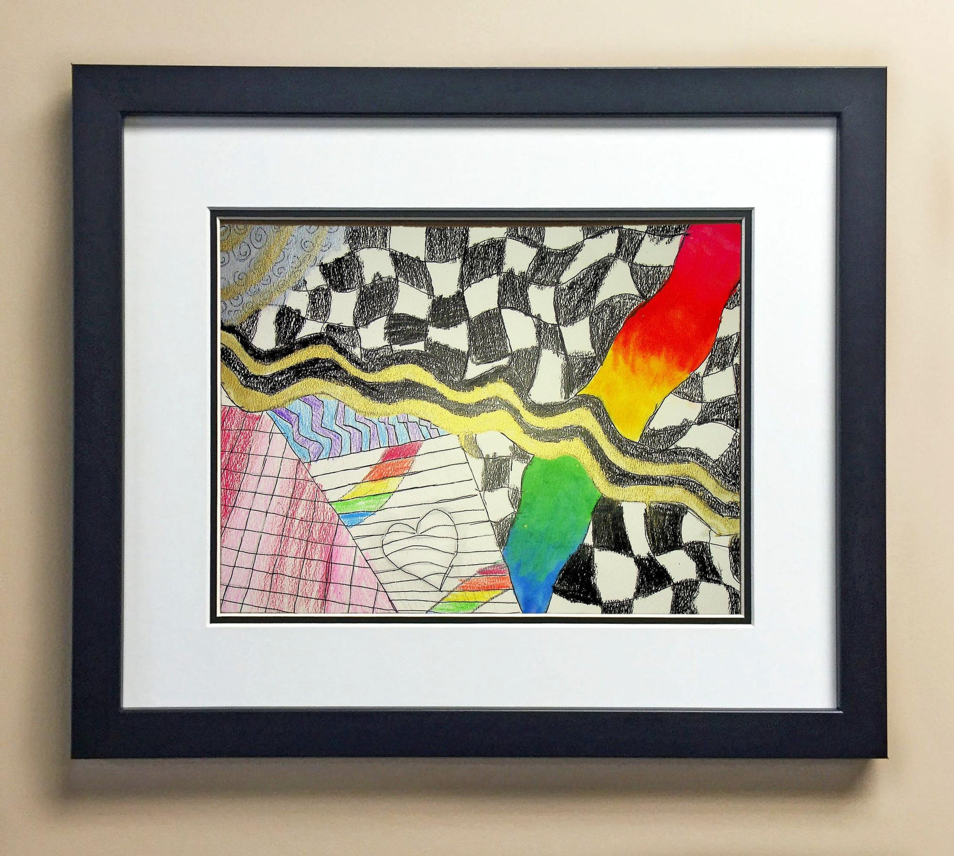 Included with the purchase is the Students Artwork, Frame, double matboard, shatter proof plexiglass, and a ready to hang backerboard with turnbuttons