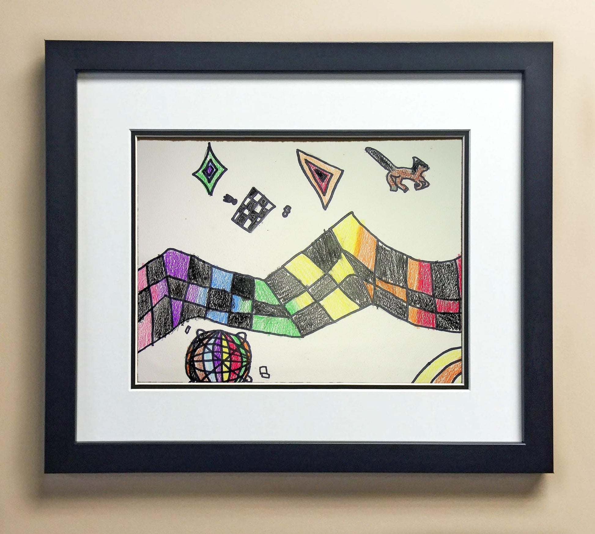 Included with the purchase is the Students Artwork, Frame, double matboard, shatter proof plexiglass, and a ready to hang backerboard with turnbuttons