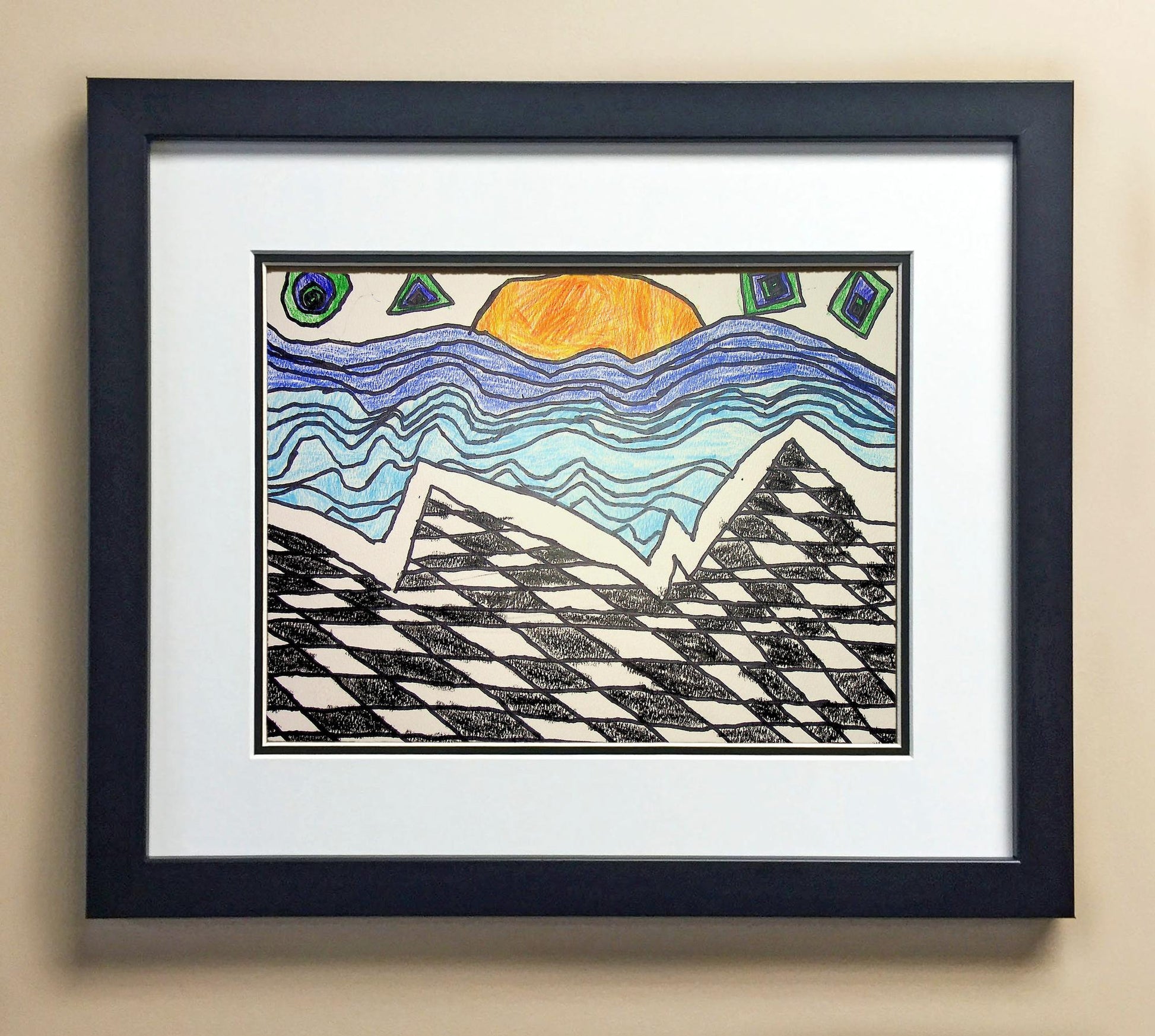 Included with the purchase is the Students Artwork, Frame, double matboard, shatter proof plexiglass, and a ready to hang backerboard with turnbuttons