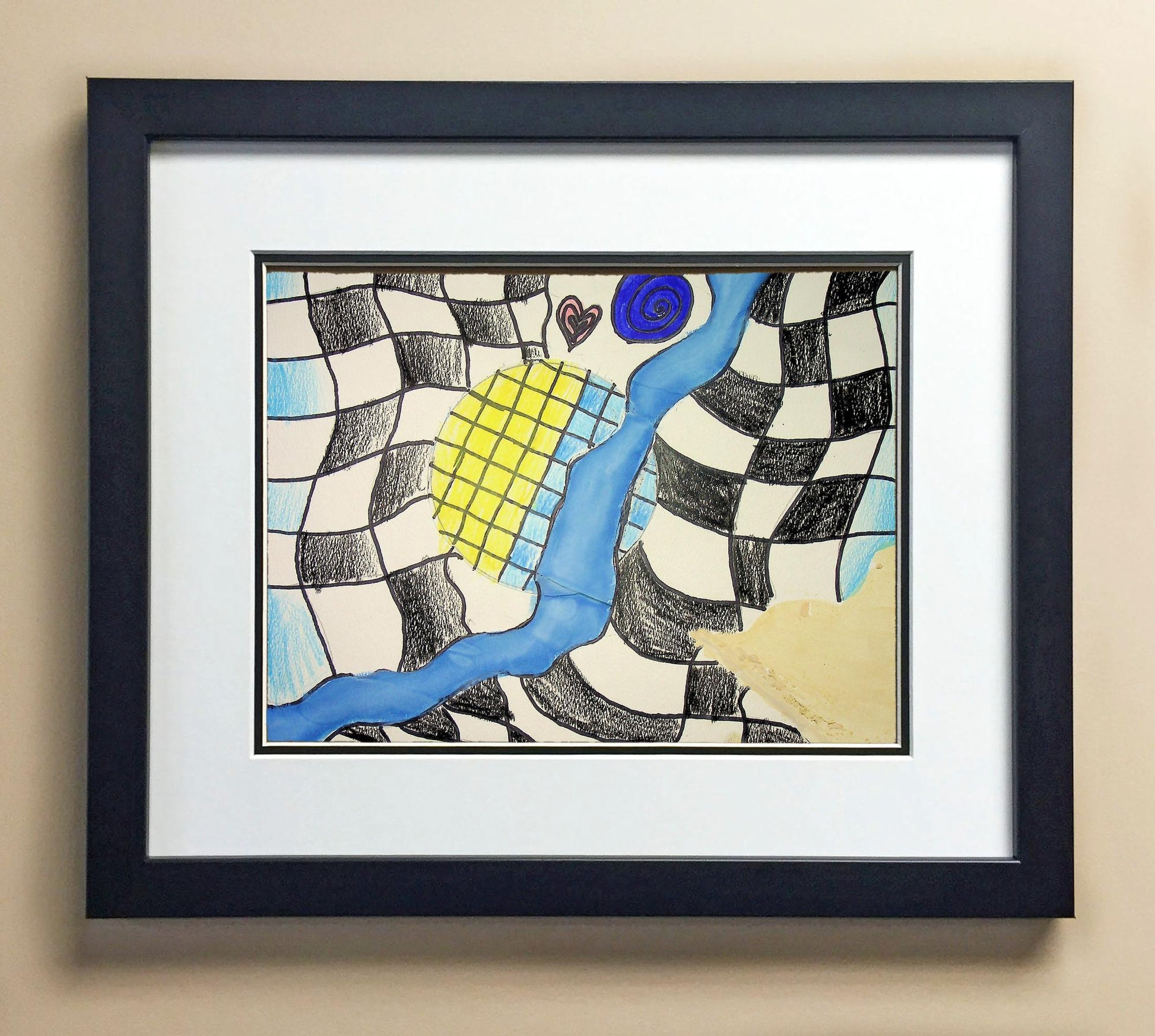 Included with the purchase is the Students Artwork, Frame, double matboard, shatter proof plexiglass, and a ready to hang backerboard with turnbuttons
