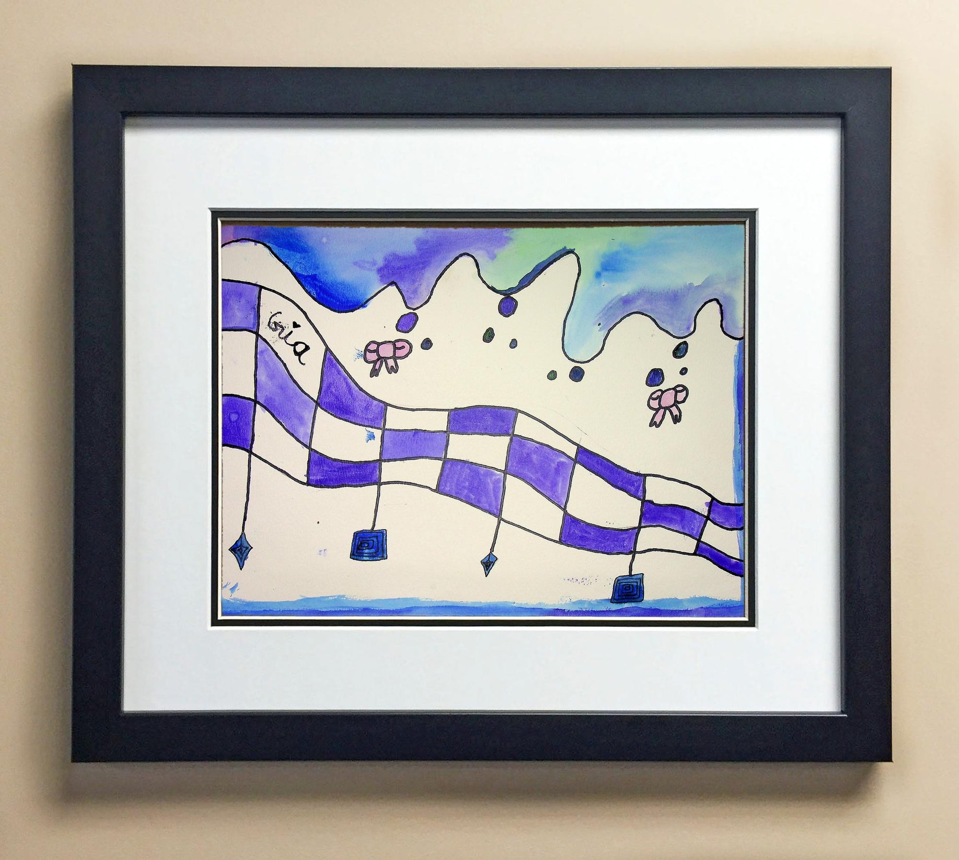 Included with the purchase is the Students Artwork, Frame, double matboard, shatter proof plexiglass, and a ready to hang backerboard with turnbuttons