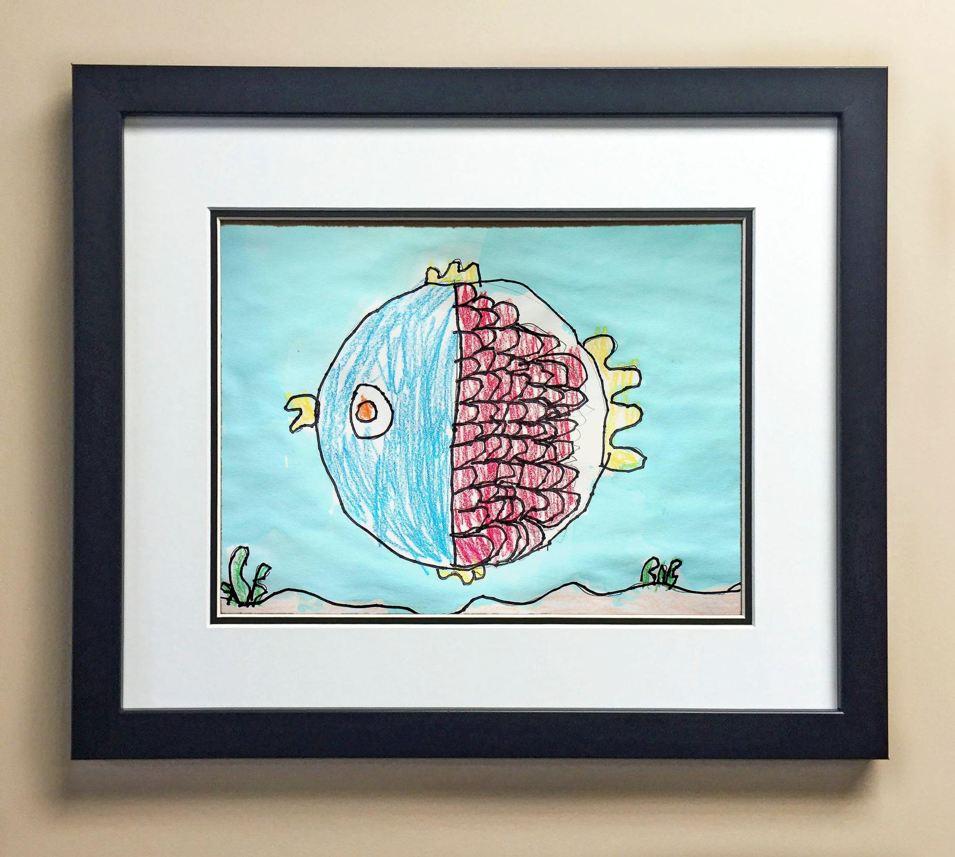 Included with the purchase is the Students Artwork, Frame, double matboard, shatter proof plexiglass, and a ready to hang backerboard with turnbuttons