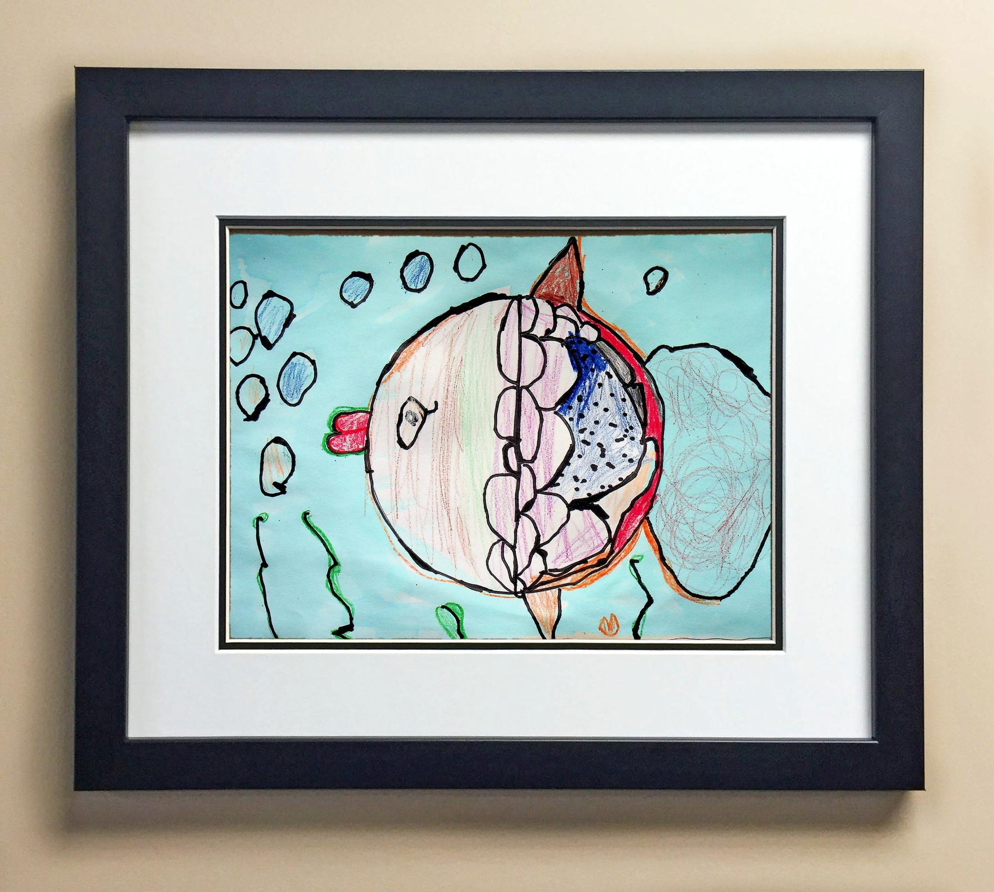 Included with the purchase is the Students Artwork, Frame, double matboard, shatter proof plexiglass, and a ready to hang backerboard with turnbuttons