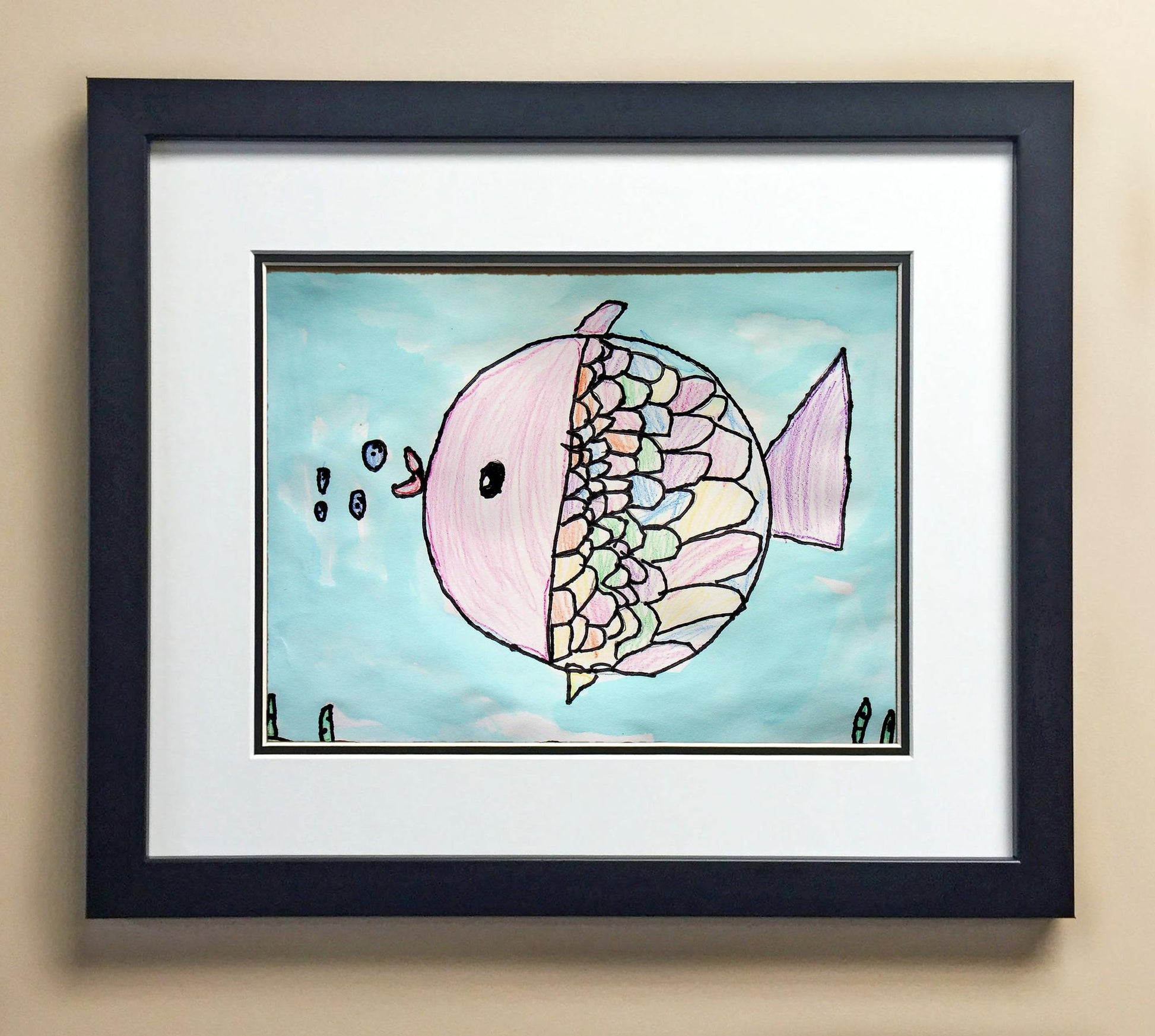 Included with the purchase is the Students Artwork, Frame, double matboard, shatter proof plexiglass, and a ready to hang backerboard with turnbuttons