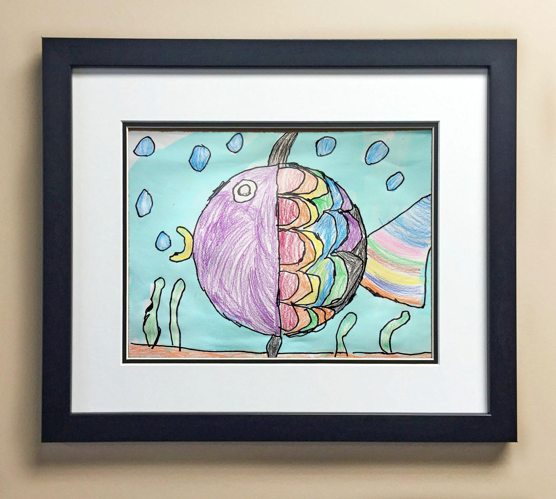 Included with the purchase is the Students Artwork, Frame, double matboard, shatter proof plexiglass, and a ready to hang backerboard with turnbuttons