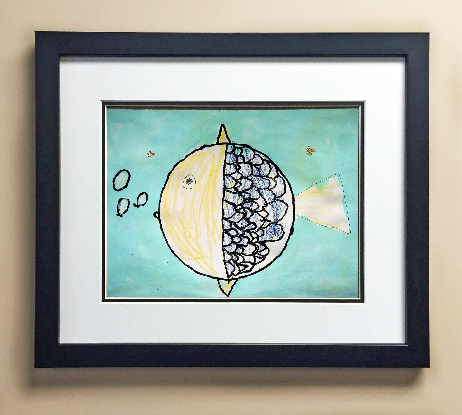 Included with the purchase is the Students Artwork, Frame, double matboard, shatter proof plexiglass, and a ready to hang backerboard with turnbuttons