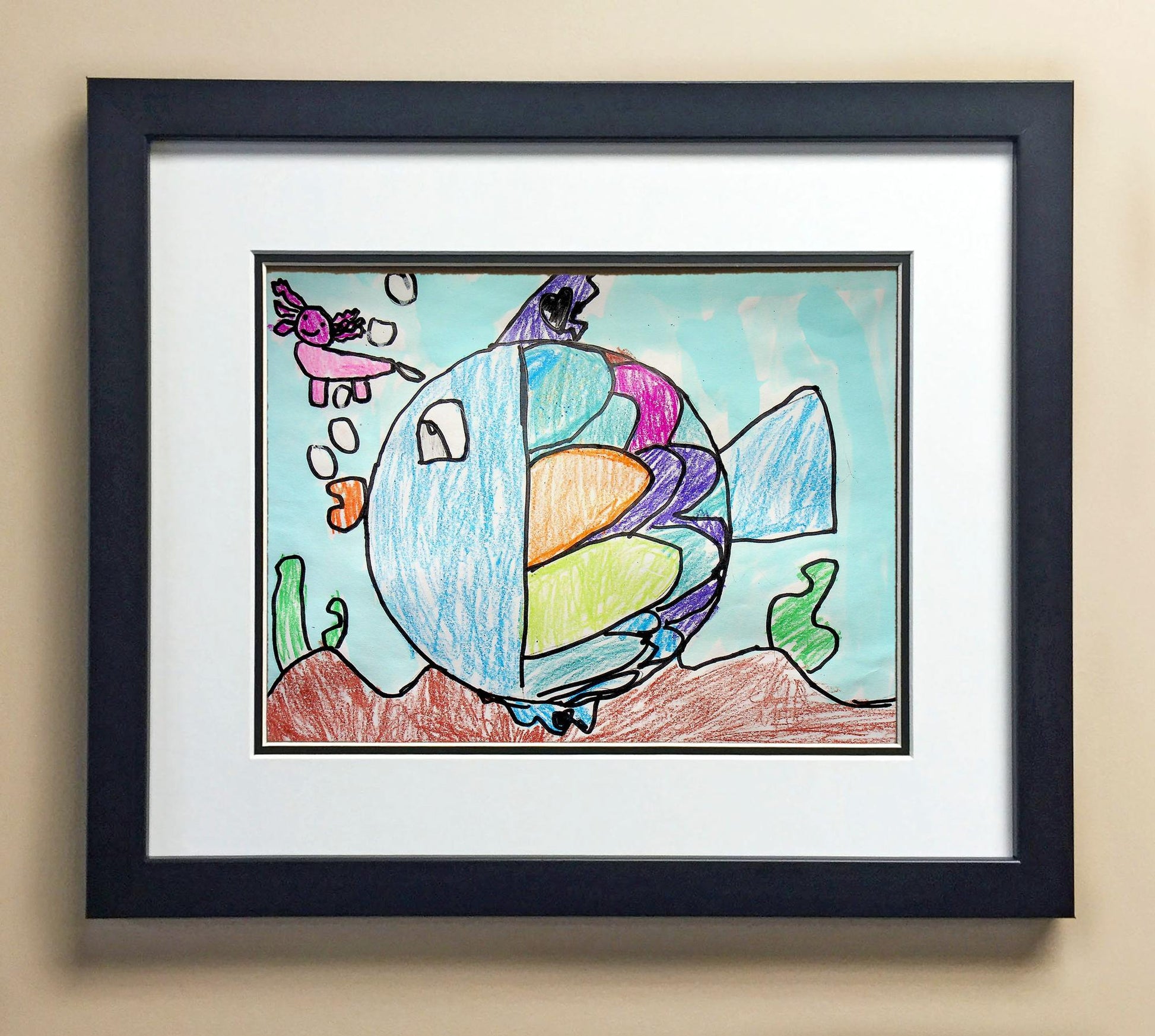 Included with the purchase is the Students Artwork, Frame, double matboard, shatter proof plexiglass, and a ready to hang backerboard with turnbuttons