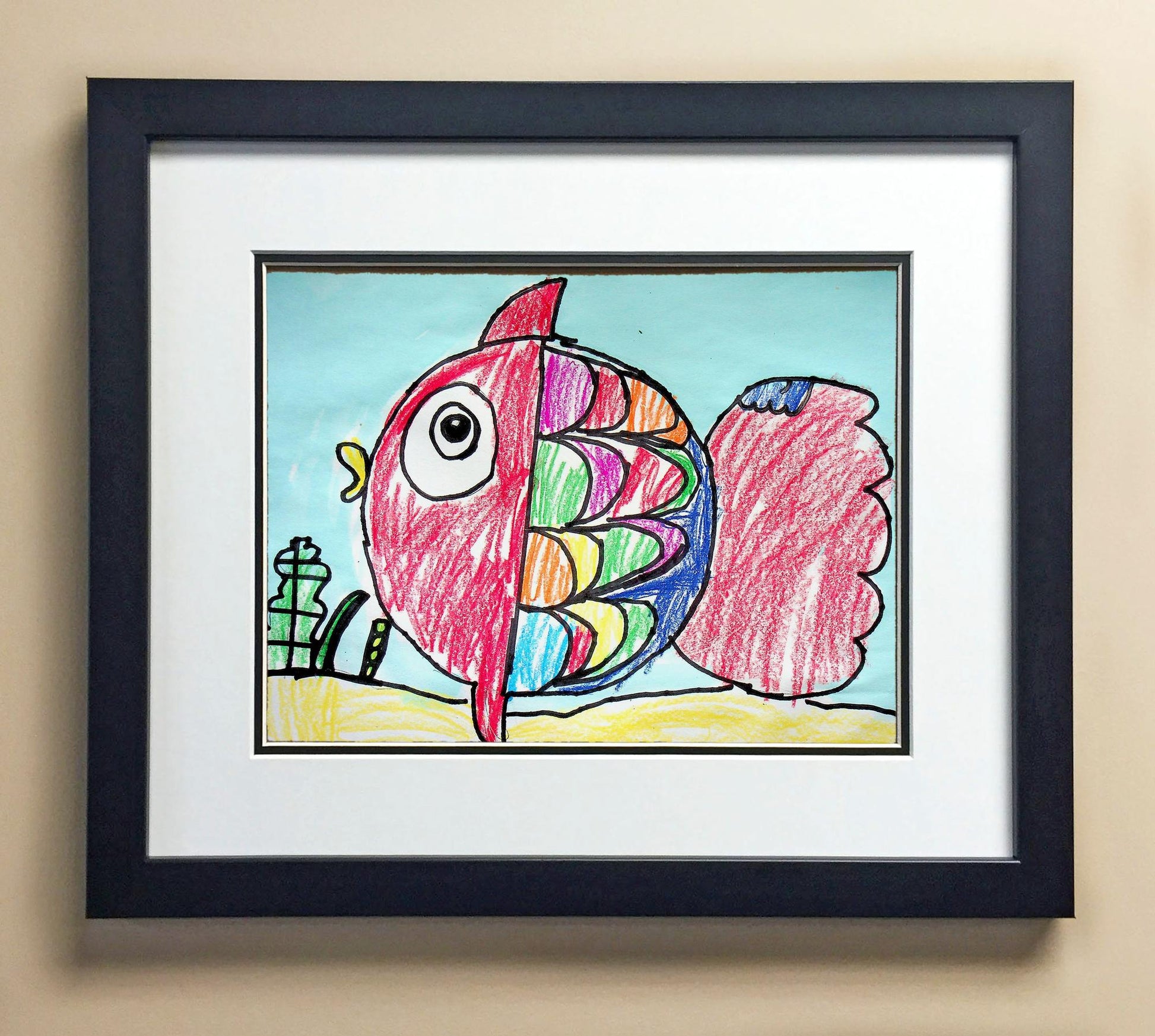 Included with the purchase is the Students Artwork, Frame, double matboard, shatter proof plexiglass, and a ready to hang backerboard with turnbuttons