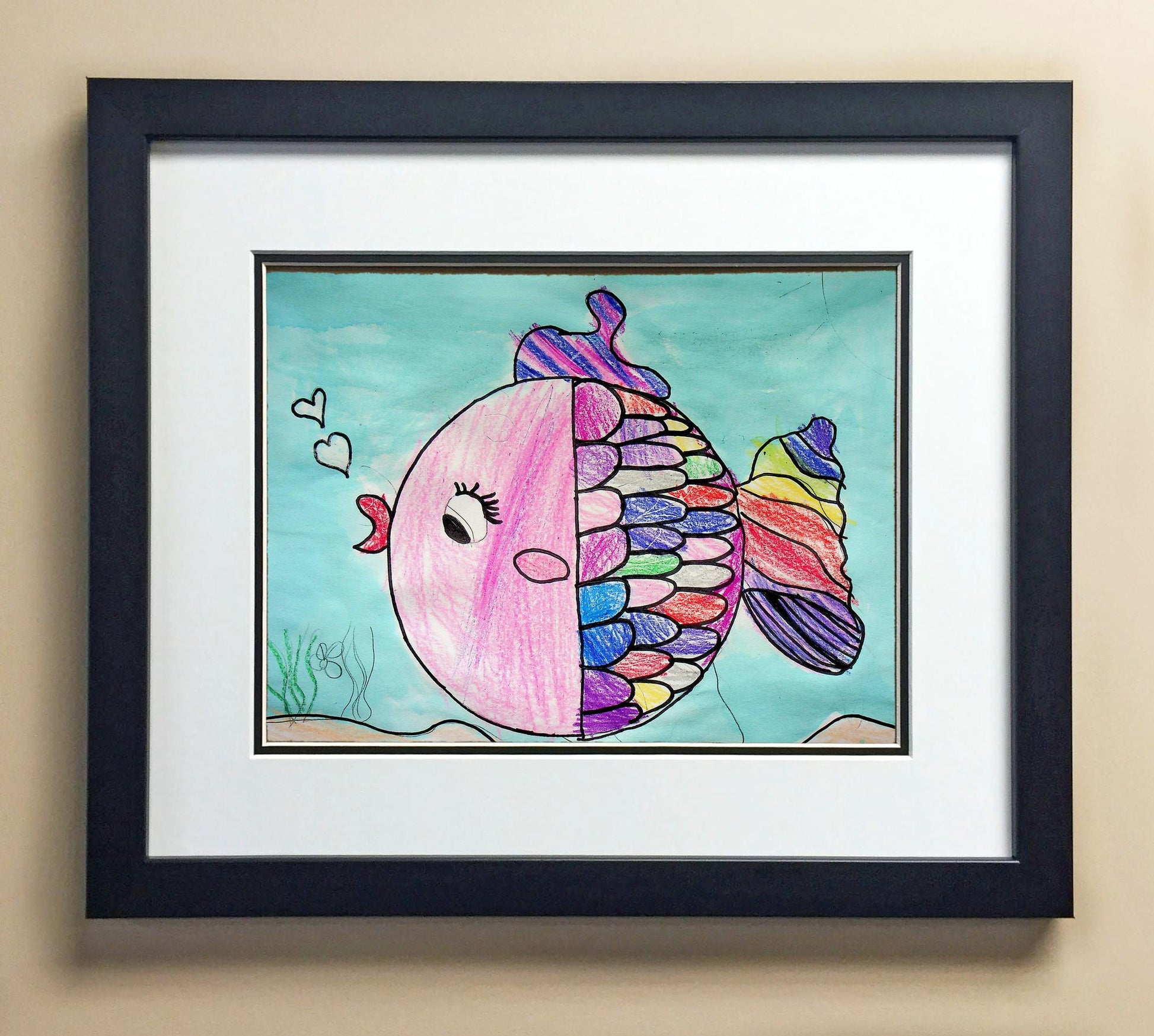 Included with the purchase is the Students Artwork, Frame, double matboard, shatter proof plexiglass, and a ready to hang backerboard with turnbuttons