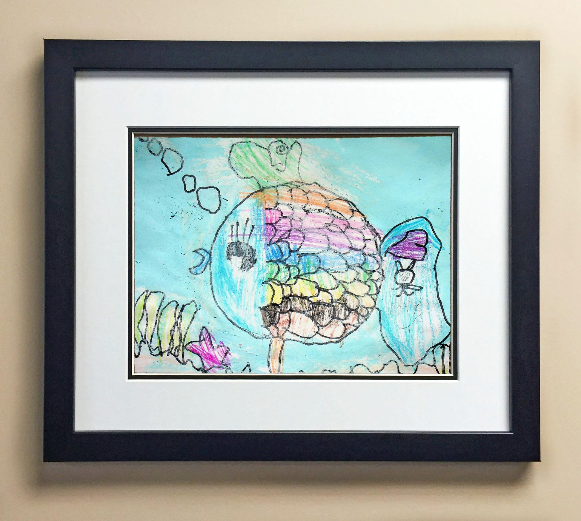 Included with the purchase is the Students Artwork, Frame, double matboard, shatter proof plexiglass, and a ready to hang backerboard with turnbuttons