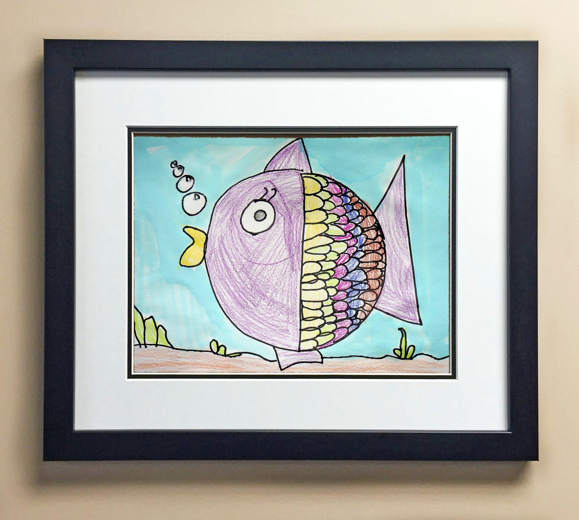 Included with the purchase is the Students Artwork, Frame, double matboard, shatter proof plexiglass, and a ready to hang backerboard with turnbuttons