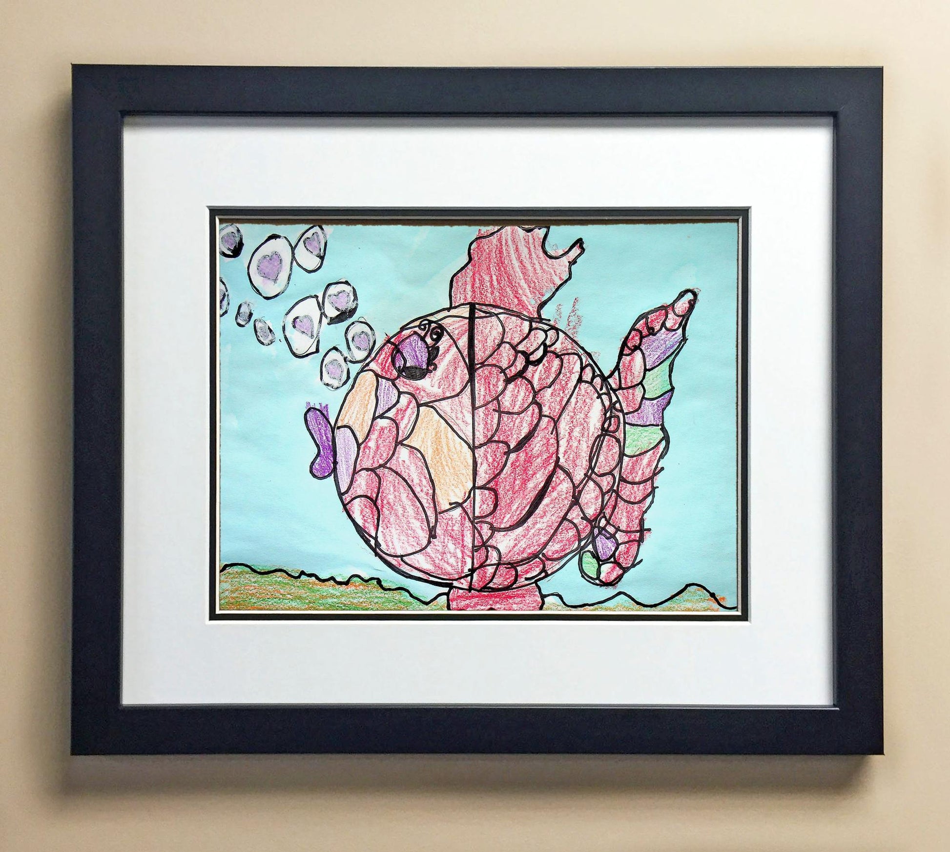 Included with the purchase is the Students Artwork, Frame, double matboard, shatter proof plexiglass, and a ready to hang backerboard with turnbuttons