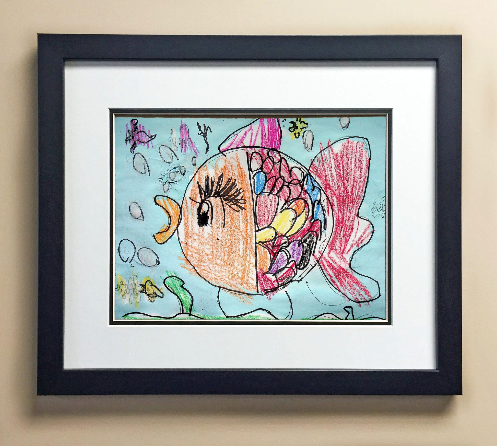 Included with the purchase is the Students Artwork, Frame, double matboard, shatter proof plexiglass, and a ready to hang backerboard with turnbuttons