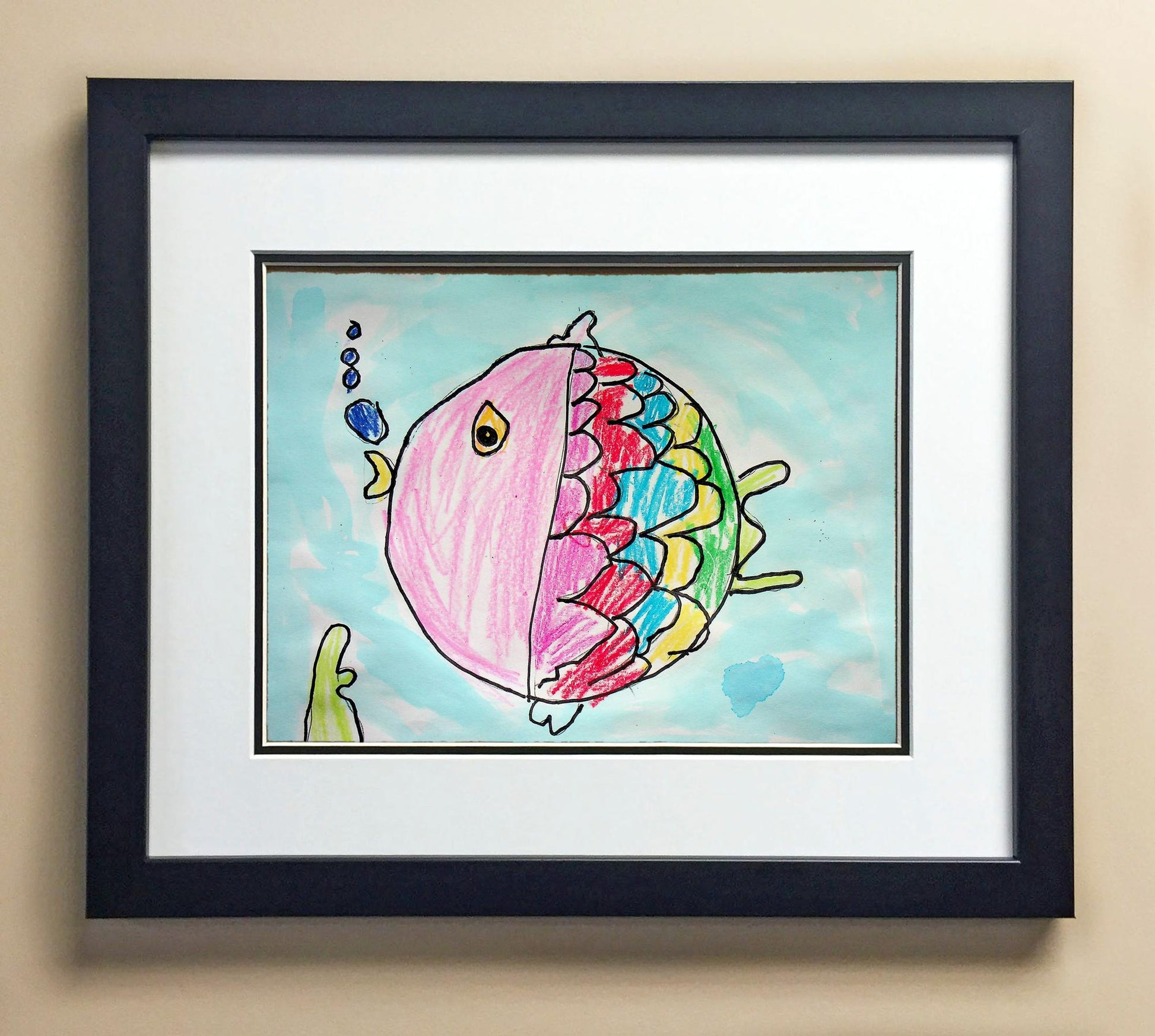 Included with the purchase is the Students Artwork, Frame, double matboard, shatter proof plexiglass, and a ready to hang backerboard with turnbuttons