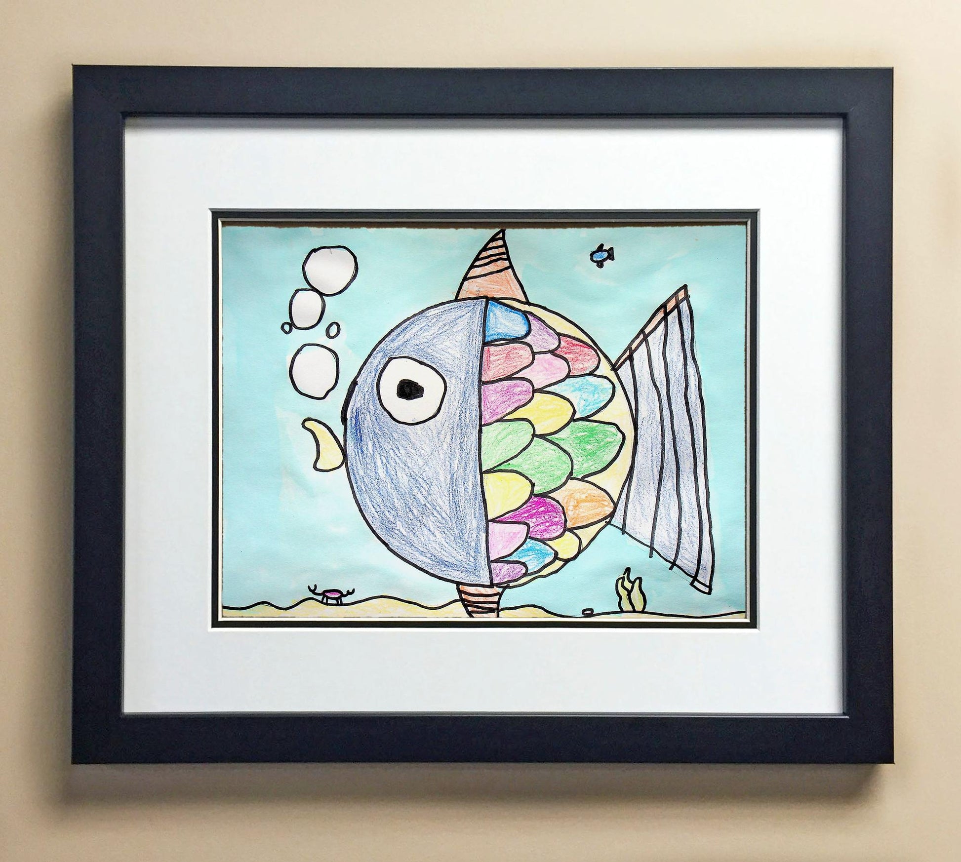 Included with the purchase is the Students Artwork, Frame, double matboard, shatter proof plexiglass, and a ready to hang backerboard with turnbuttons