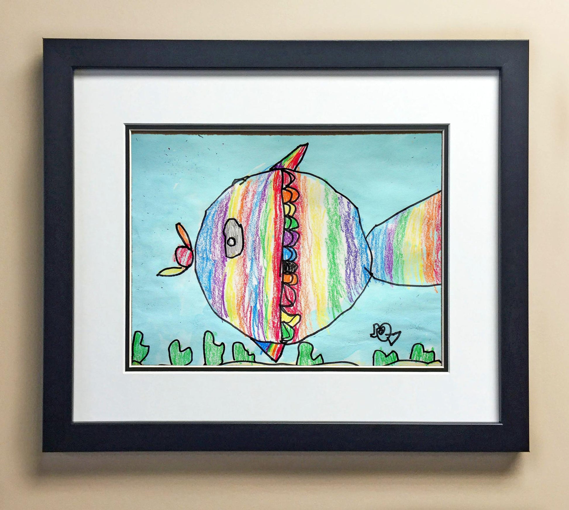 Included with the purchase is the Students Artwork, Frame, double matboard, shatter proof plexiglass, and a ready to hang backerboard with turnbuttons