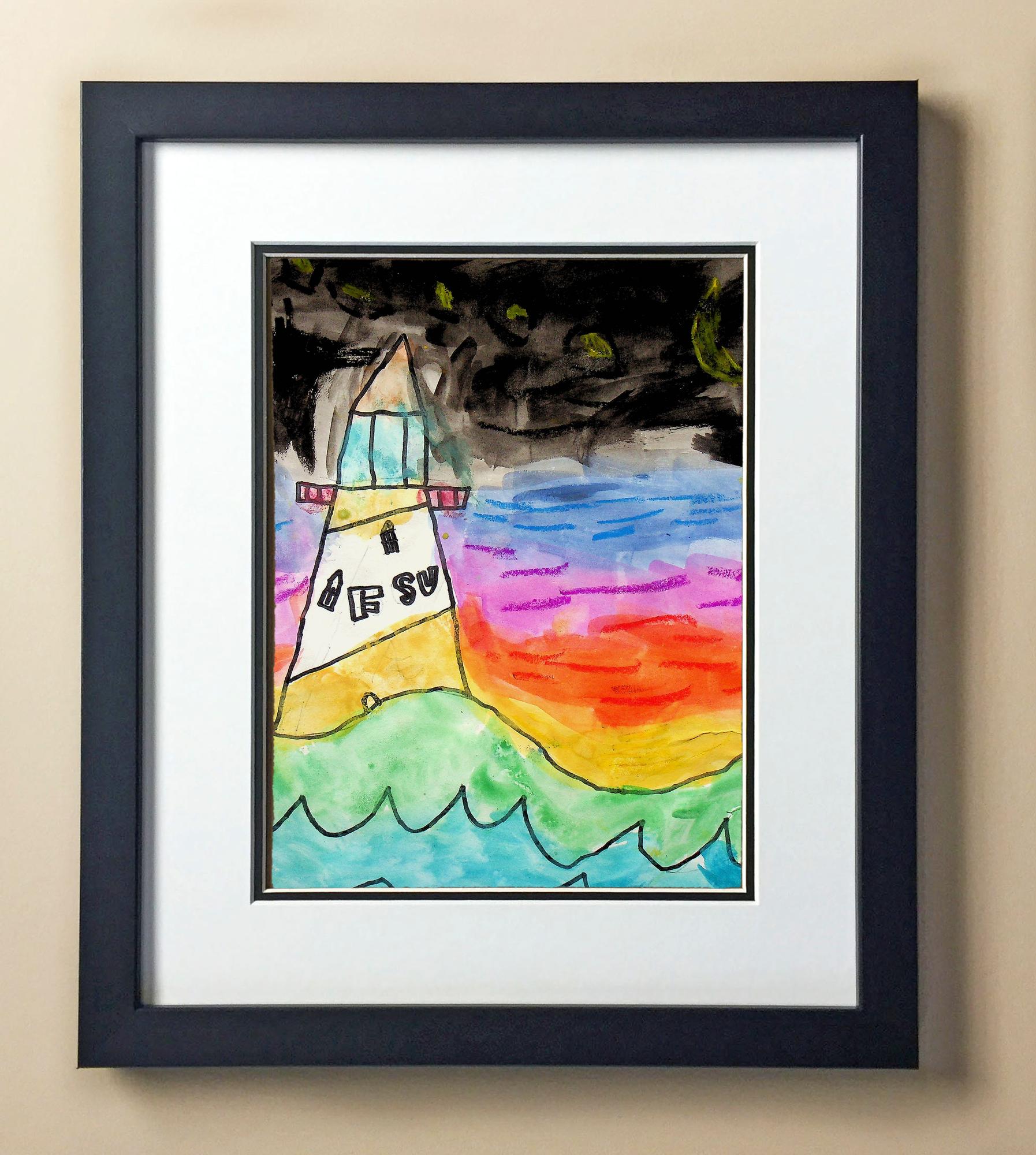 Included with the purchase is the Students Artwork, Frame, double matboard, shatter proof plexiglass, and a ready to hang backerboard with turnbuttons