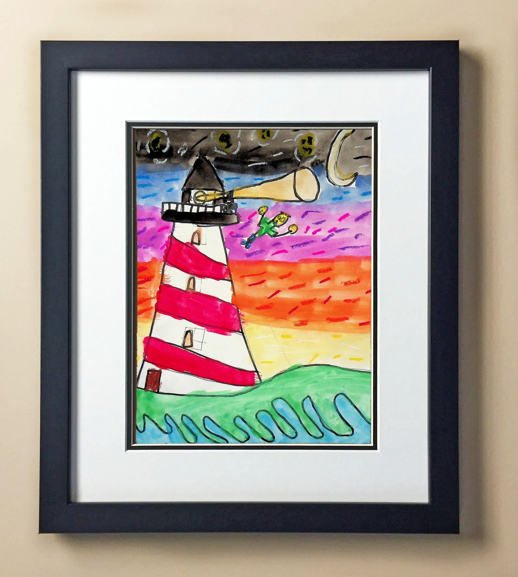 Included with the purchase is the Students Artwork, Frame, double matboard, shatter proof plexiglass, and a ready to hang backerboard with turnbuttons